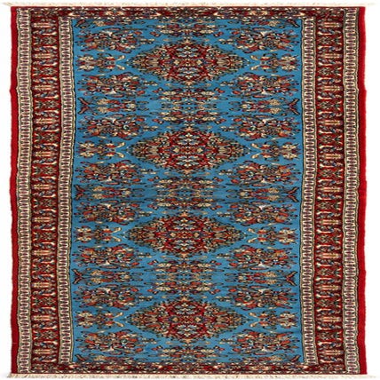 This runner would make a sophisticated addition to a variety of interior settings. Its elongated shape is particularly suited to hallways, entryways, or as a focal point in living areas where space allows. In terms of decor, the runner would complement traditional interiors with its intricate pattern, but could also serve as a striking contrast piece in more modern or minimalistic spaces that benefit from a pop of color and pattern. The blue and red hues would pair well with neutral color palettes, enabling the rug to stand as a statement piece, or with more vibrant decor where it could contribute to a rich, layered look.