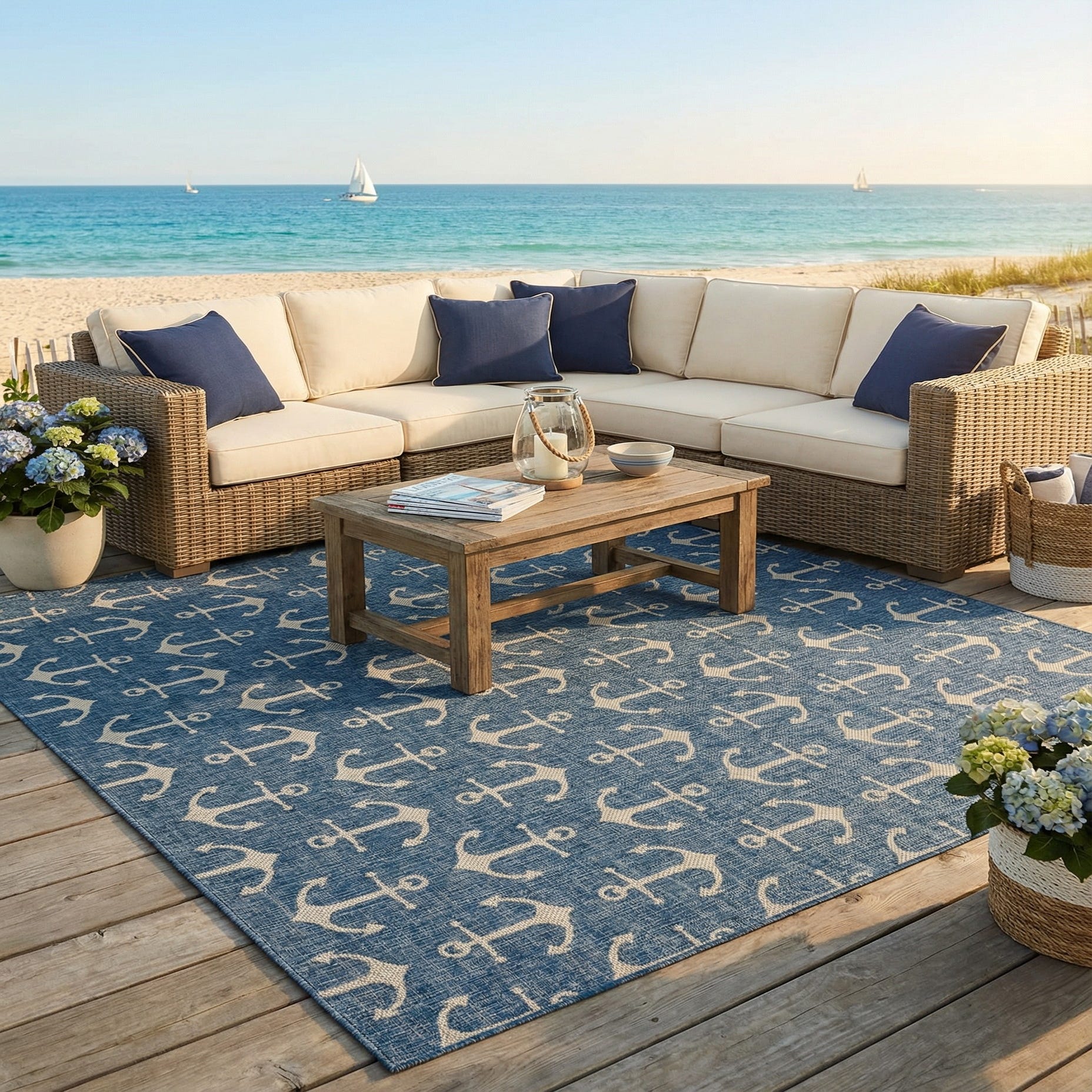 A square blue indoor/outdoor rug with a repeating pattern of light-colored anchors, perfect for a patio.