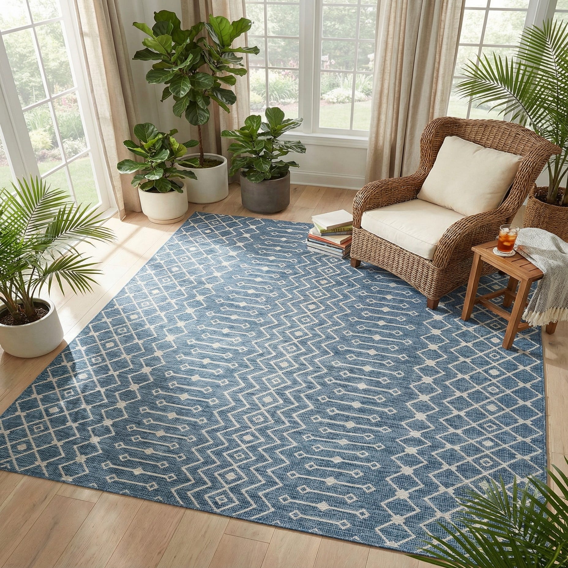 A 13' square blue indoor/outdoor rug with a modern trellis pattern in white, featuring geometric diamonds and vertical lines.