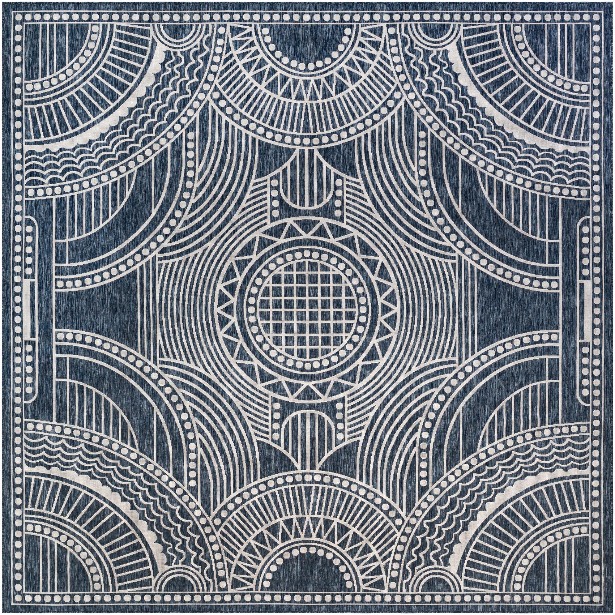 A 13' square blue indoor/outdoor rug with a white traditional medallion and geometric pattern, ideal for a patio.
