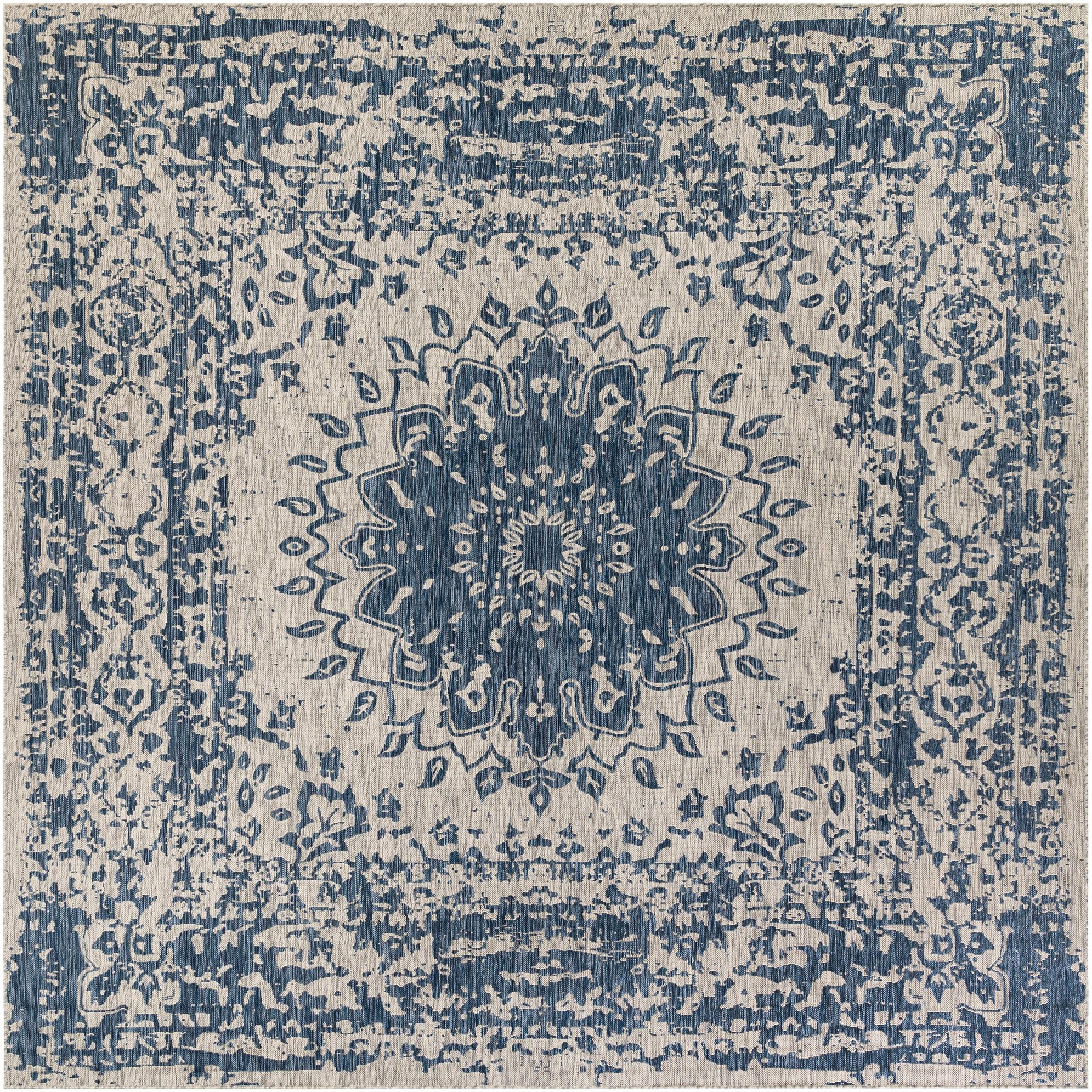 A 13' square blue and beige modern outdoor rug featuring a large distressed medallion pattern.