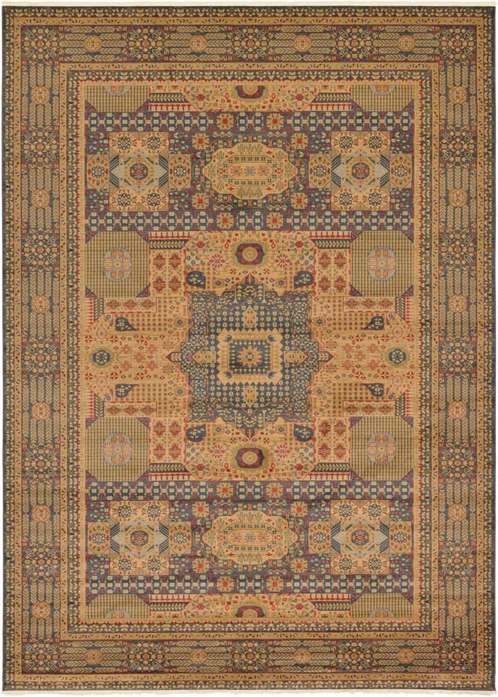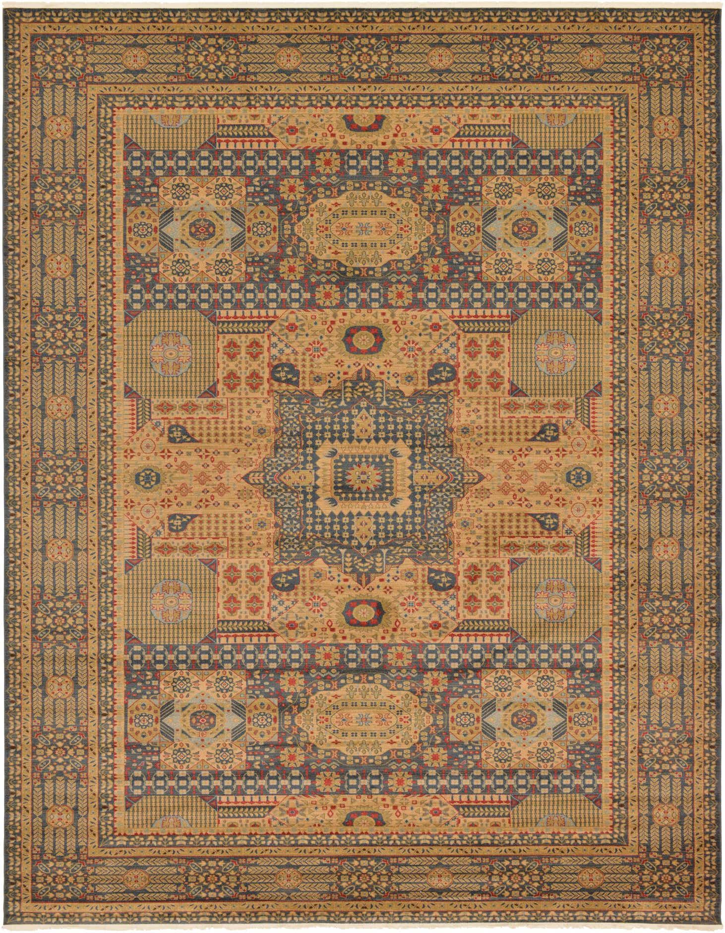 Primary color is Blue. Colors in this rug include: Blue, Light Blue, Light Brown, Red, Tan, Olive, Light Green.