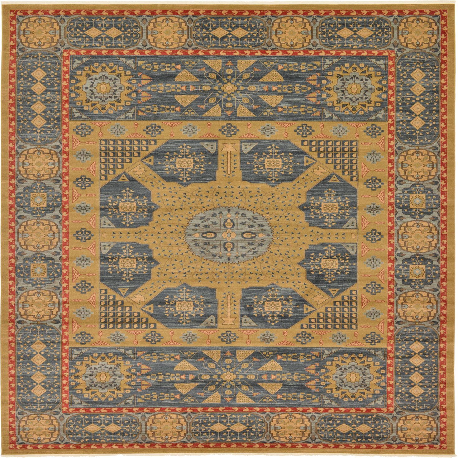 Primary color is Blue. Colors in this rug include: Blue, Brown, Olive, Tan, Light Blue, Light Brown, Red.