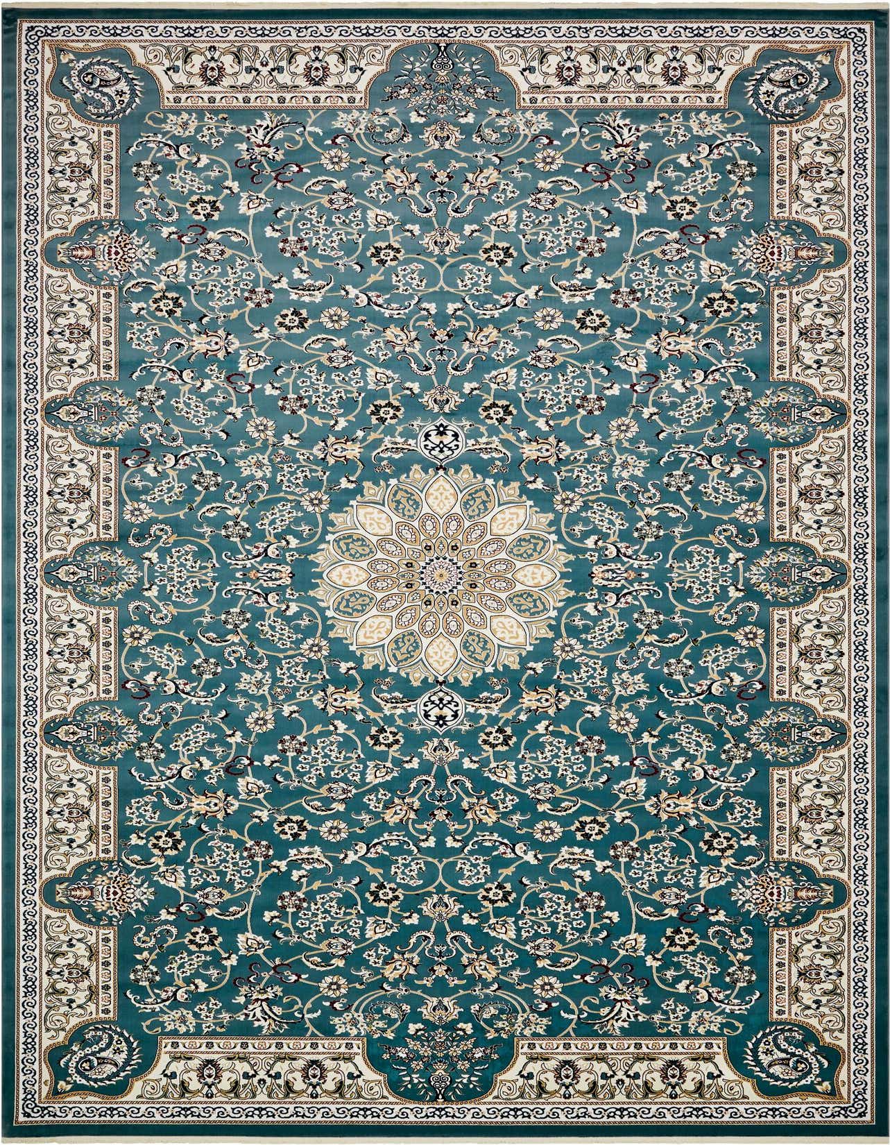 Primary color is Blue. Colors in this rug include: Blue, Beige, Burgundy, Cream, Green, Ivory, Navy Blue, Puce.
