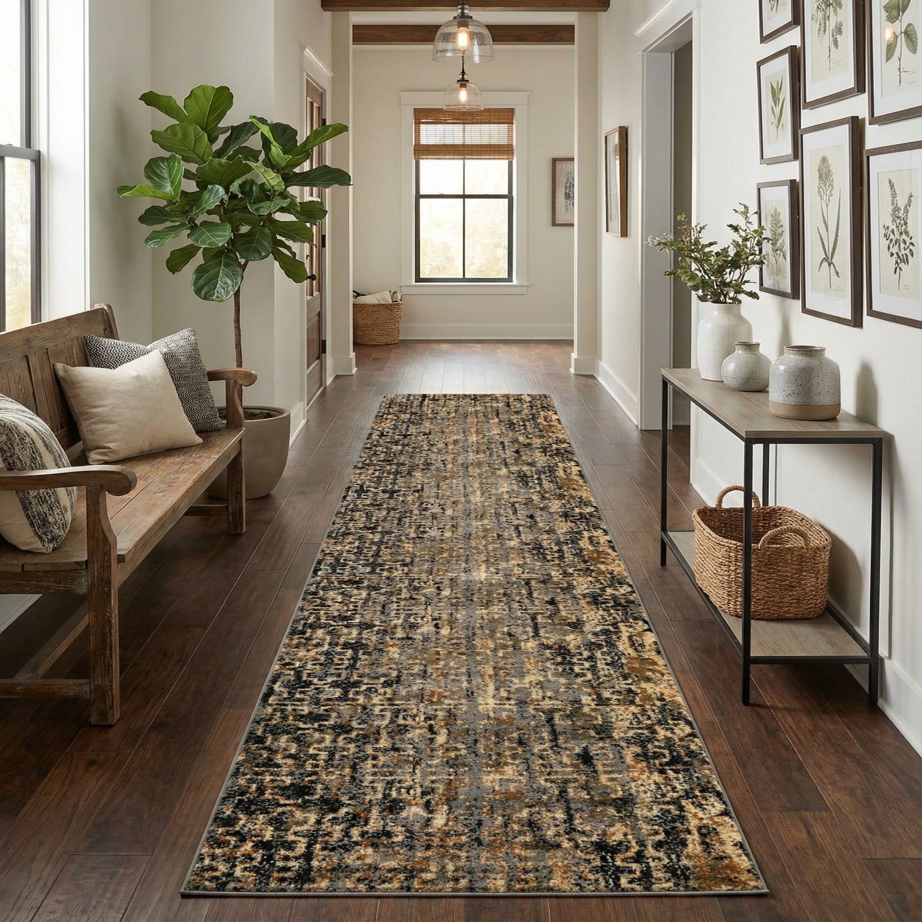 Machine made of 100% polypropylene, the rug has a low, dense pile that feels smooth underfoot and preserves crisp pattern definition. Its color palette and worn-in finish work well in transitional and modern interiors — try it in a hallway, entryway, or kitchen galley. Pair it with warm wood tones and brass or matte-black metal finishes for contrast, or use it to add depth to a neutral living space alongside gray upholstery and olive or navy accents.