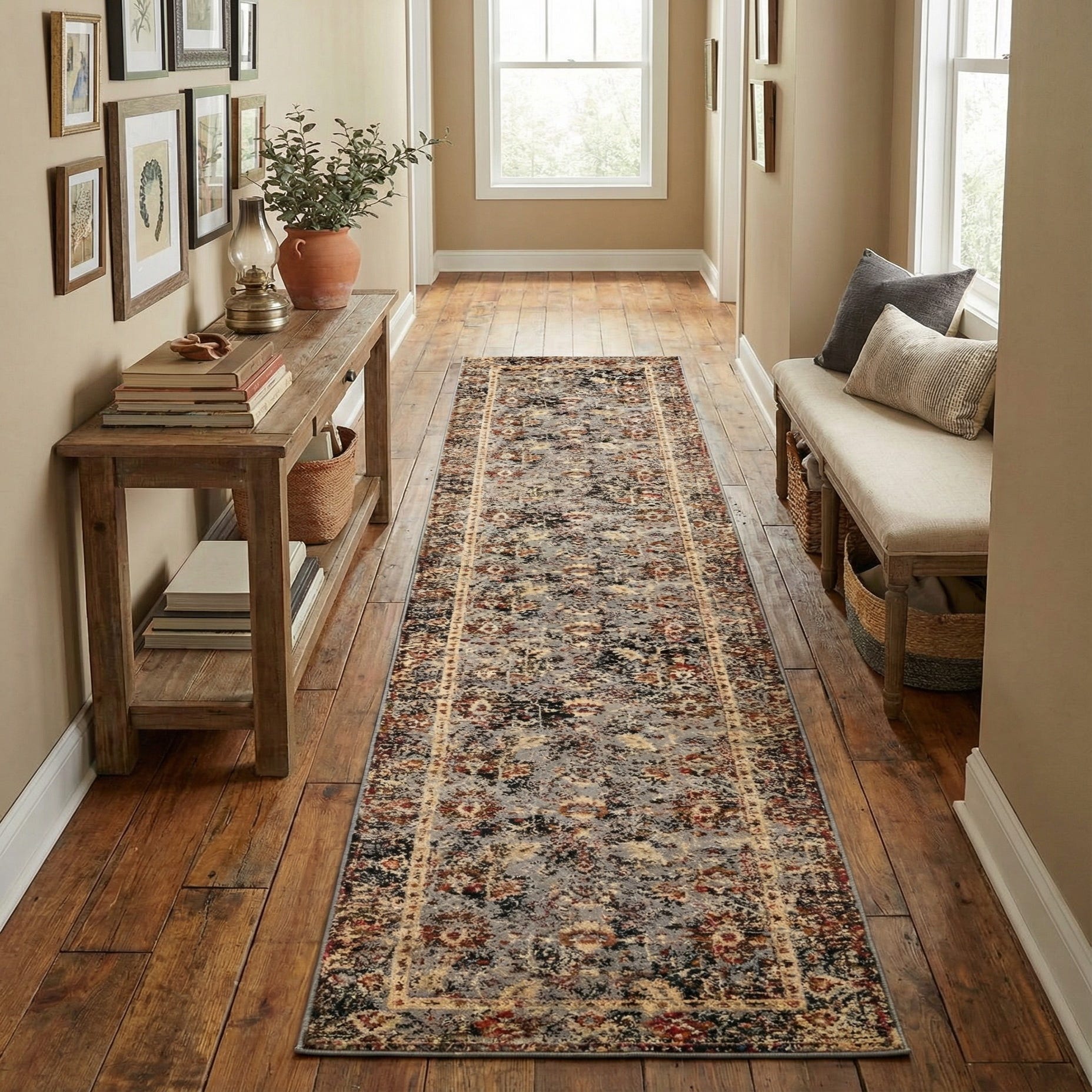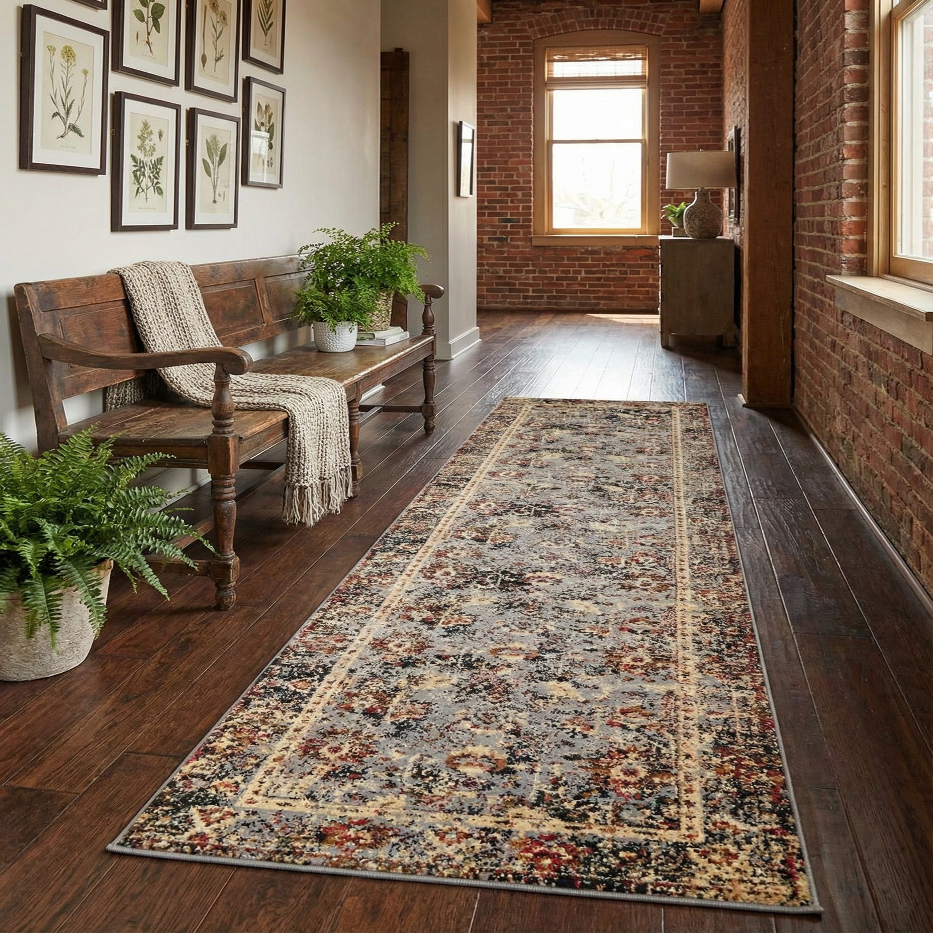 This long, narrow format works well in entryways, hallways, alongside beds or in kitchen galley layouts where you want pattern and color without overwhelming the space. Pair it with warm wood tones and neutral upholstery for a classic transitional scheme, introduce hammered metal and exposed brick for a softened industrial look, or layer it in a bohemian setting with textured throws and mixed-pattern accessories for added depth and color.