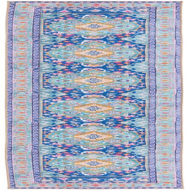Primary color is Blue. Colors in this rug include: Blue, Black, Ivory, Green, Gold, Red, Pink, Orange.