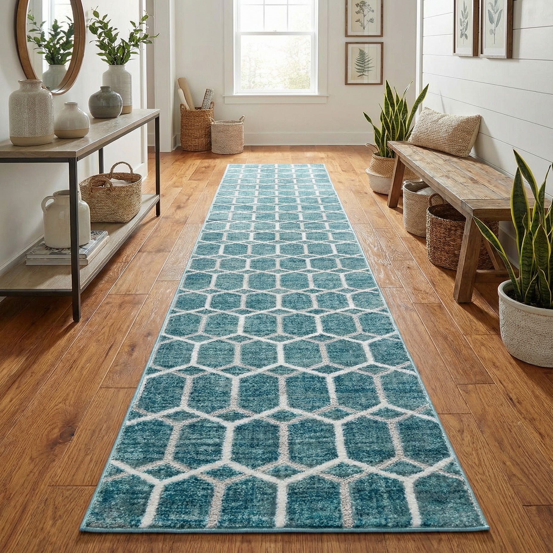 Machine made from 100% polyester, this runner pairs a modern, graphic silhouette with practical performance. The cool blue palette works well in coastal, transitional, or contemporary settings—use it to define a long hallway, anchor an entryway, or add color and pattern alongside kitchen cabinetry. It also complements light wood floors, white or gray furnishings, and metallic accents for a balanced, updated look.