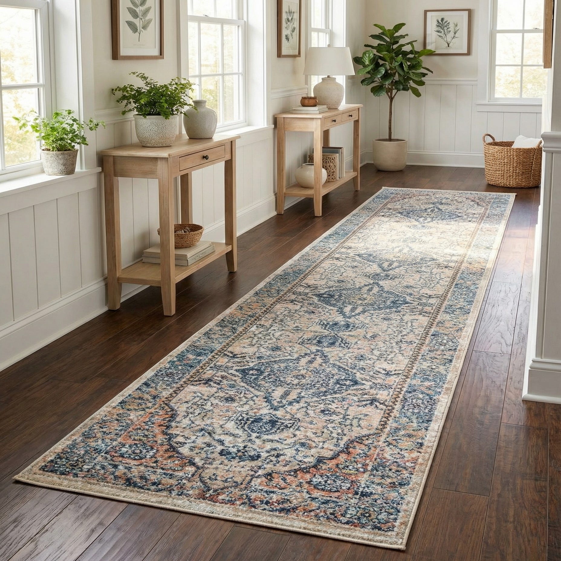 This runner suits hallways, entryways, and narrow spaces where patterned interest is welcome—pair it with painted navy cabinets or white trim for a coastal or transitional scheme, with warm wood furniture for a farmhouse look, or layer it into an eclectic, bohemian room to anchor mixed textures and colors. Its balanced color palette and vintage character make it easy to coordinate with both neutral and bold furnishings.