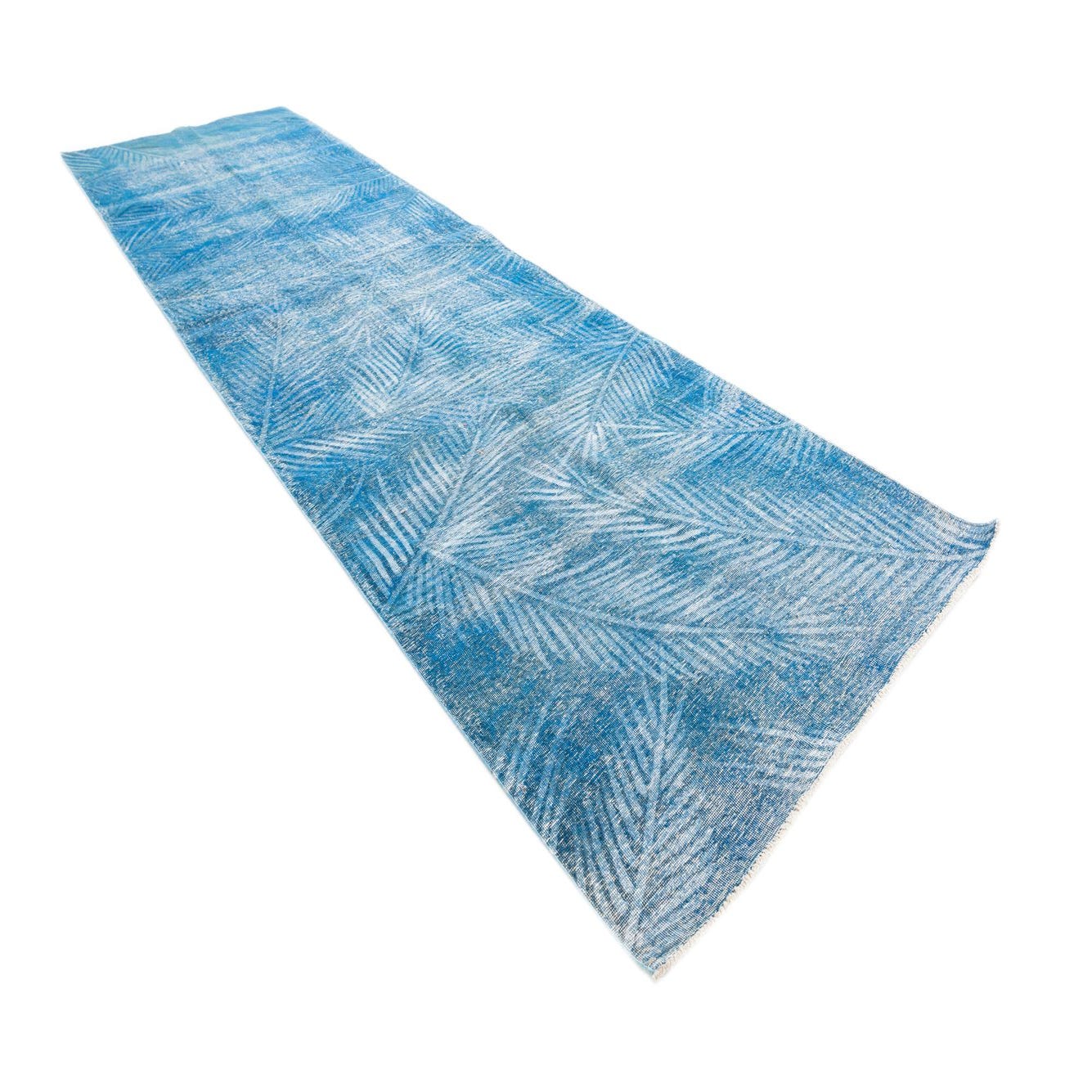 This hand-knotted Ultra Vintage collection runner brings a harmonious blend of sophistication and character to any elongated space. Expertly crafted of 100% wool, the 15 ft runner showcases a distinctive pattern of ivory palm fronds dispersed across a tranquil blue background. The natural wool construction ensures a plush texture underfoot, while the runner's generous length makes it a fitting choice for hallways, entryways, or alongside a bed in a bedroom, providing a luxurious visual and tactile experience. The presence of fringe on both ends adds a classic finish to the rug's aesthetic.