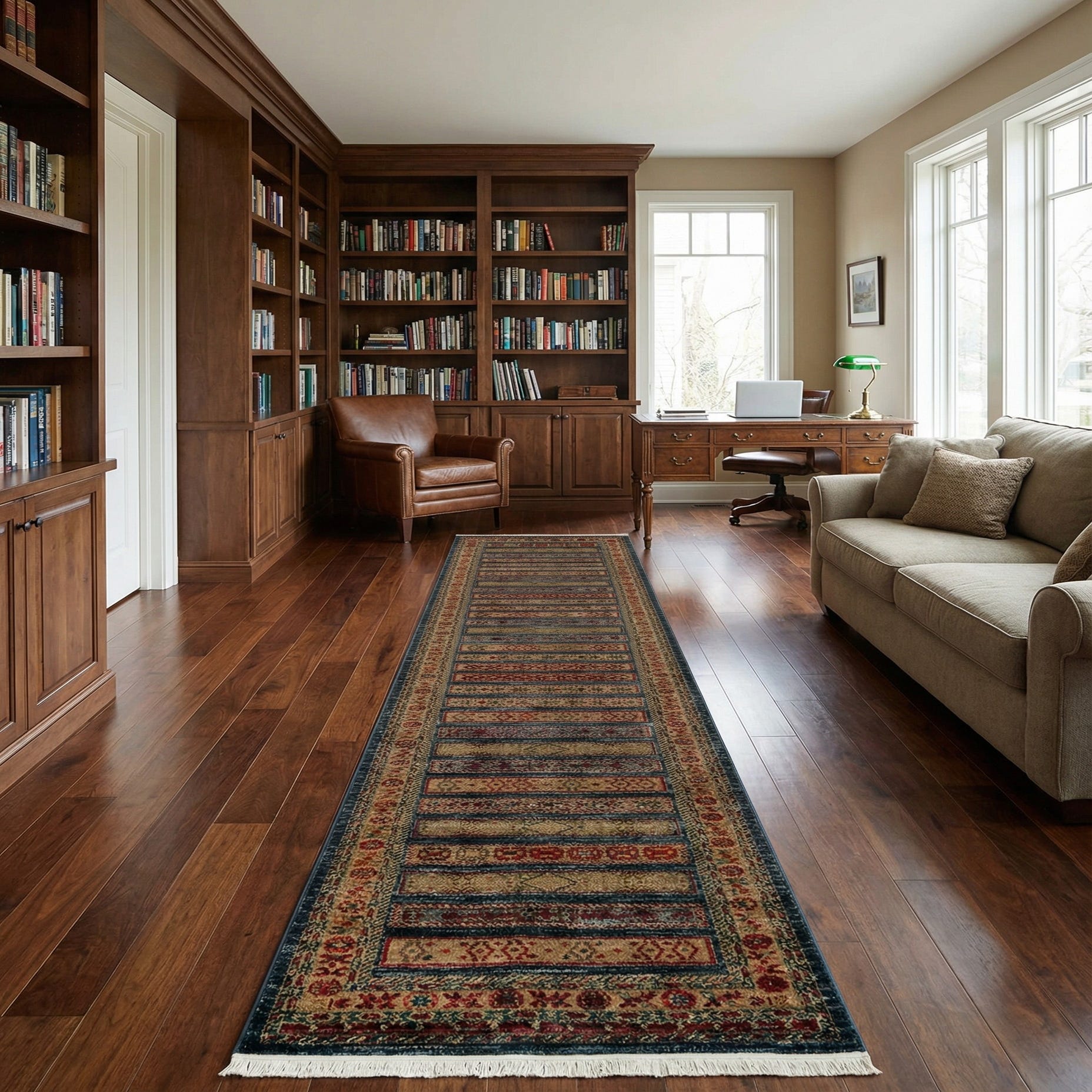 Machine-made from 100% polypropylene, the rug offers a low, dense pile with a smooth hand and a faint sheen under light. It’s well suited to long, narrow spaces—use it to define a hallway or entry, run it alongside a kitchen island, or place it in front of a bed in a master suite. The color palette pairs easily with warm woods and aged metals, lending itself to traditional, transitional, or globally influenced interiors that benefit from a measured pop of pattern and color.