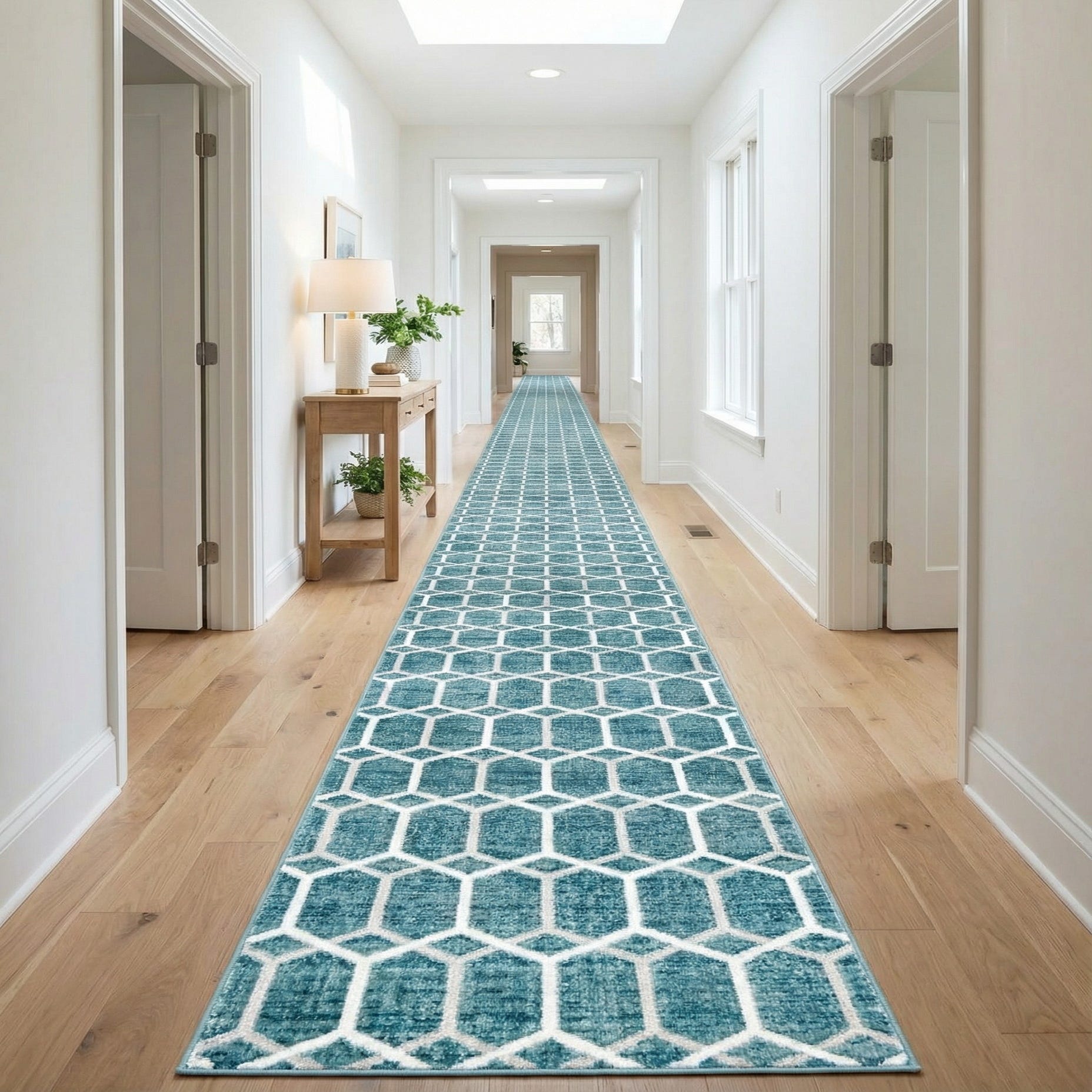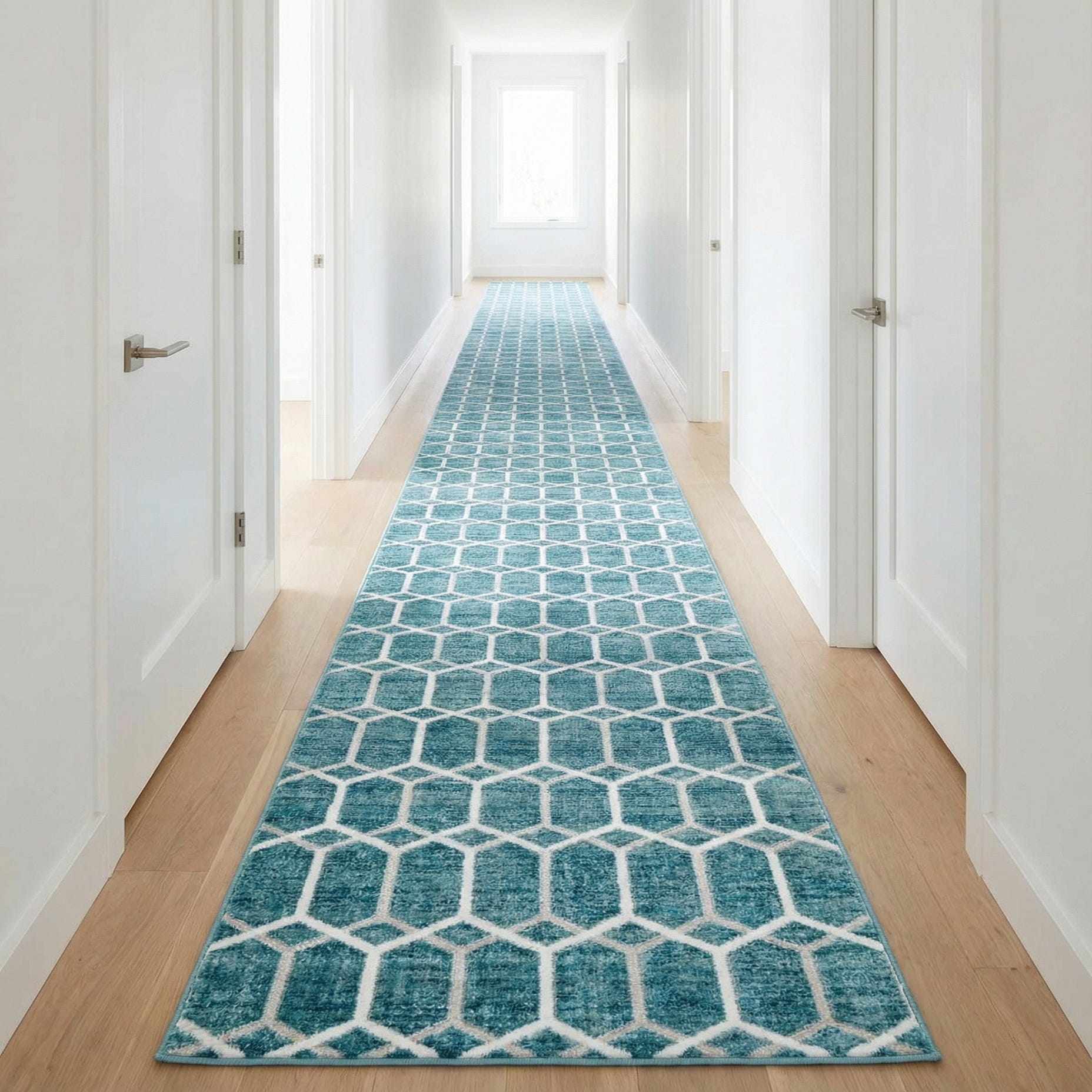 A geometric trellis pattern gives this runner a modern yet approachable look. A rich blue field provides the background while an ivory lattice of hexagonal motifs creates a crisp, repeating pattern across the length. Subtle gray and light-blue tones are woven into the field, adding depth and a gently faded effect that keeps the overall look relaxed rather than stark. The machine-made, 100% polyester pile has a soft hand and low profile that feels smooth underfoot and lays neatly in high-traffic narrow spaces.