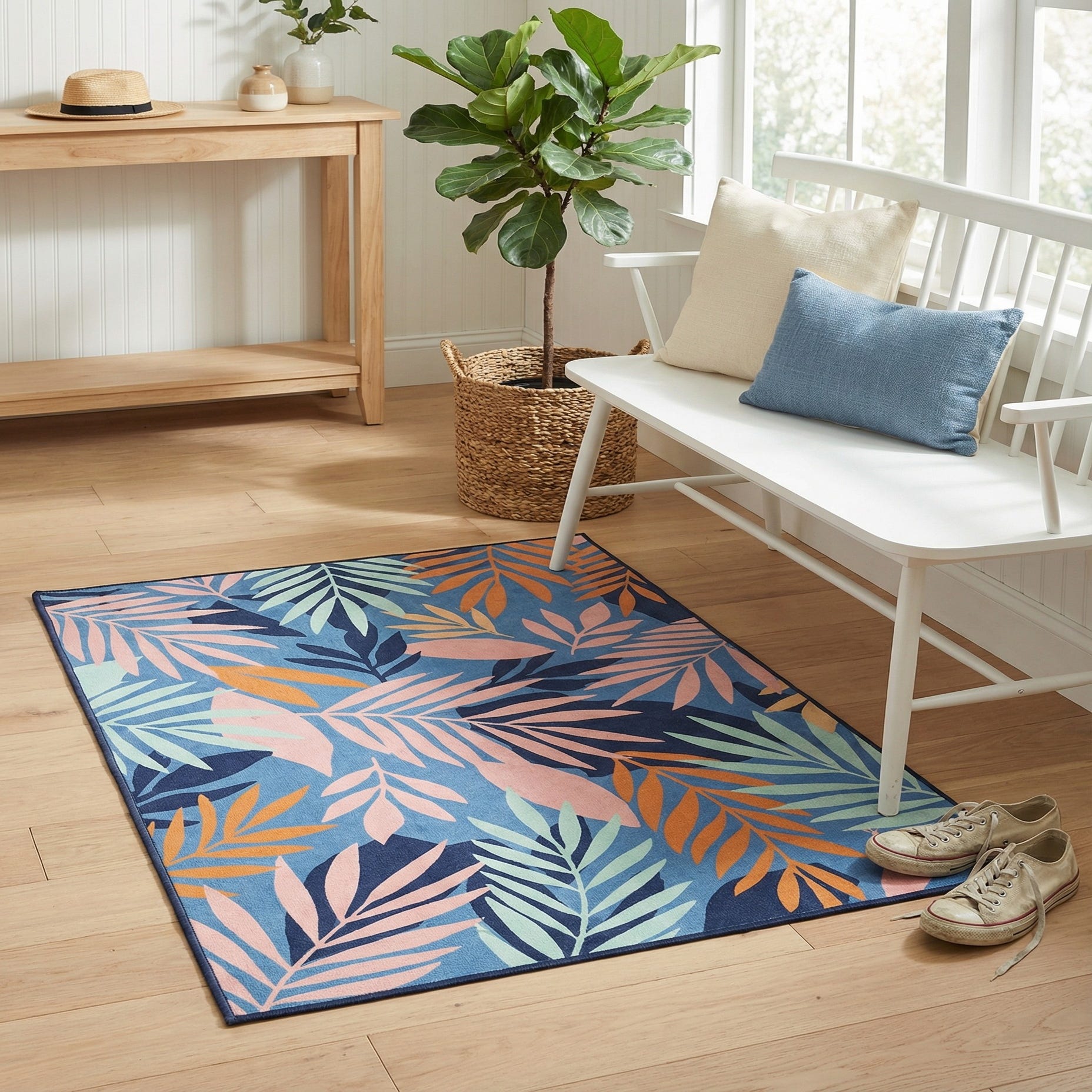 A 2x3 rectangular Aruba Outdoor rug featuring a light blue base with a textured trellis pattern of colorful, leaf-like shapes in fuchsia, orange, light blue, and navy, framed by a light brown border.