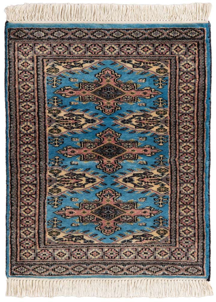 A 2x3 rectangular Bokhara rug featuring a traditional tribal pattern in various shades of blue, pink, and beige, with white fringe.