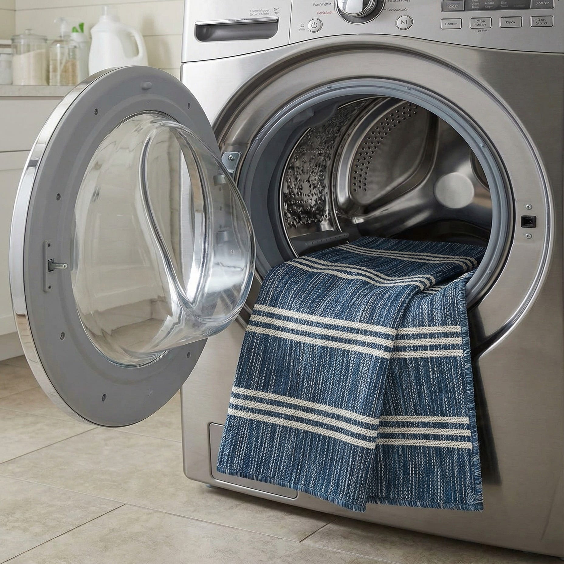 Machine made from 100% polypropylene for outdoor use, this rug works well where you want durable, attractive flooring underfoot. Place it on a covered patio or balcony, at a busy entryway, or in a casual kitchen or mudroom to anchor seating and dining areas. It pairs easily with natural woods, wicker or teak furniture, crisp white textiles and navy accents for coastal, nautical, or modern-farmhouse schemes.