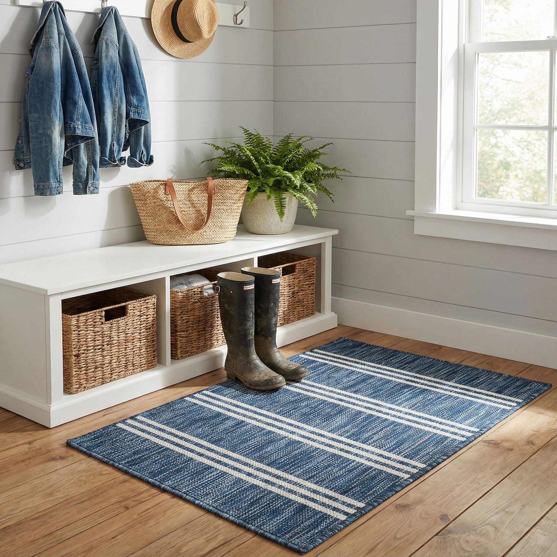 A clean, stripe-forward design gives this outdoor rug a fresh, relaxed look. Multi-tonal blue yarns form a textured, variegated ground that reads like woven denim, while sets of three ivory bands cross the field at even intervals to create bold horizontal accents. The flatweave construction is tight and low-profile, with a slightly firm hand and visible woven texture that highlights the polypropylene yarns and a neatly finished short-fringe on the narrow ends.