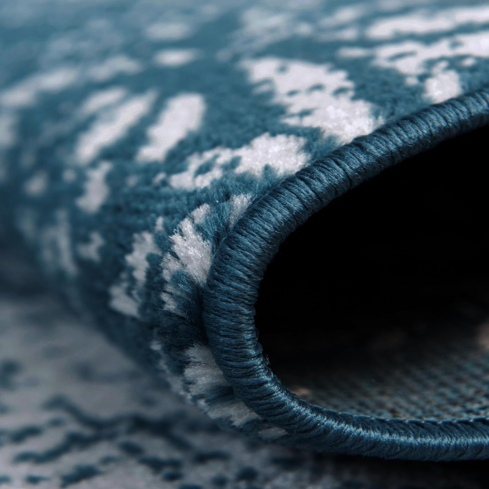 A distressed, ornamental pattern anchors this rug, where scrolling florals and arabesque motifs in ivory sit against a rich blue ground. The design has a gently worn, vintage-inspired quality with areas of intentional irregularity that add visual depth and movement. The surface is machine-made with a short, dense pile that feels smooth underfoot and offers a low-profile touch that layers well in a variety of rooms.