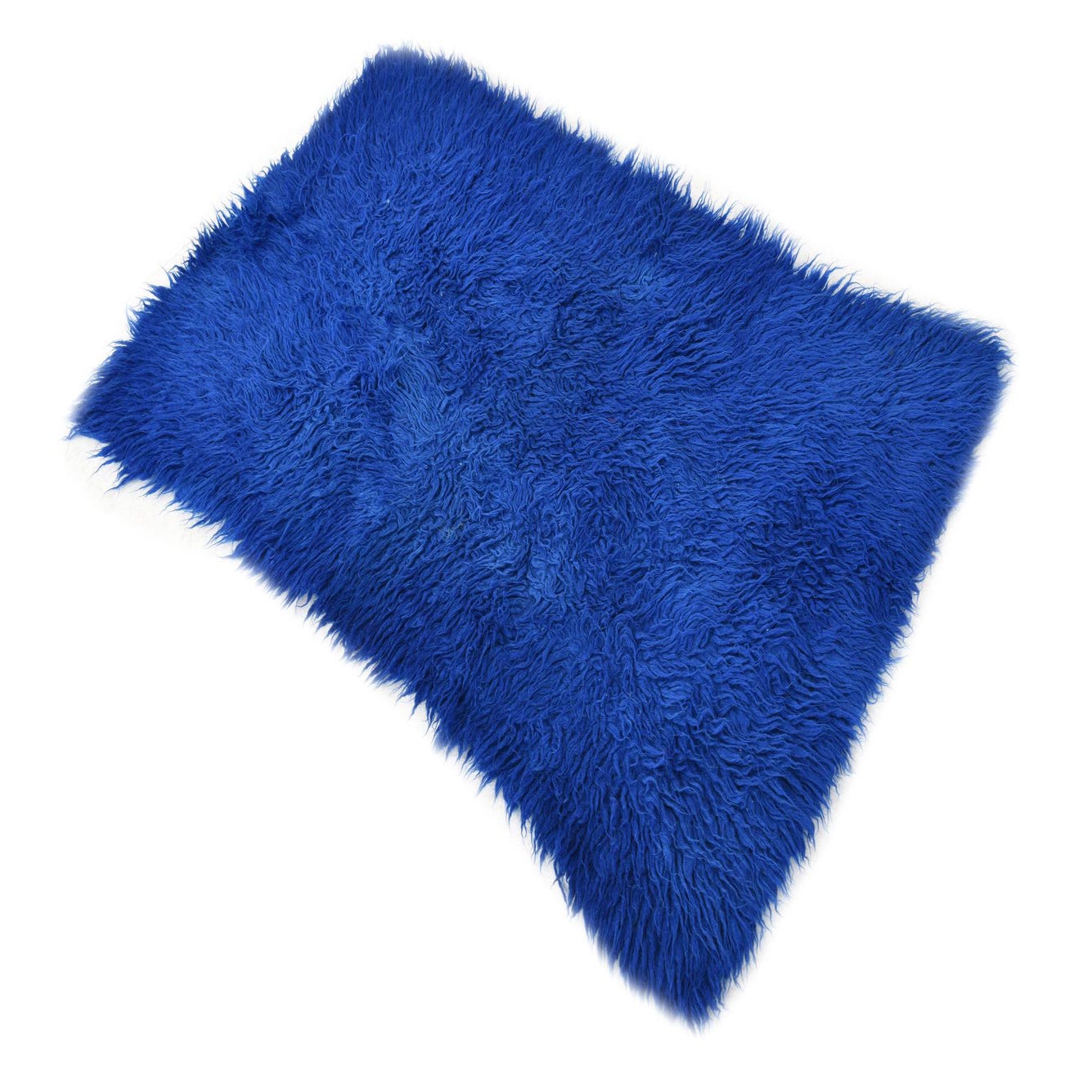 A rectangular 2x3 blue shag rug with a thick, plush pile, handmade from 100% wool.