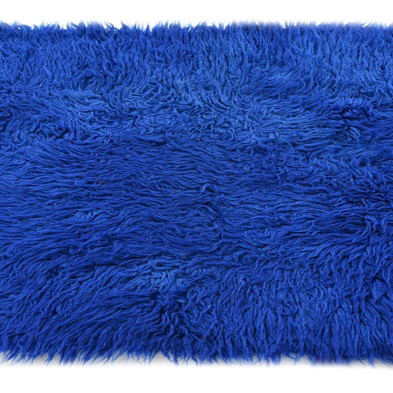 A rich, deep blue field of long, hand-knotted wool creates a plush, shaggy surface with subtle tonal shifts where the pile catches the light. The rug’s pattern is essentially a solid expanse of color, but the hand-knotted construction and varying pile direction give the surface movement and depth. The edges are softly irregular, reinforcing the handcrafted character, while the dense, lofty wool strands feel springy and warm underfoot. Made from 100% wool, the texture is tactile and inviting without being fussy.