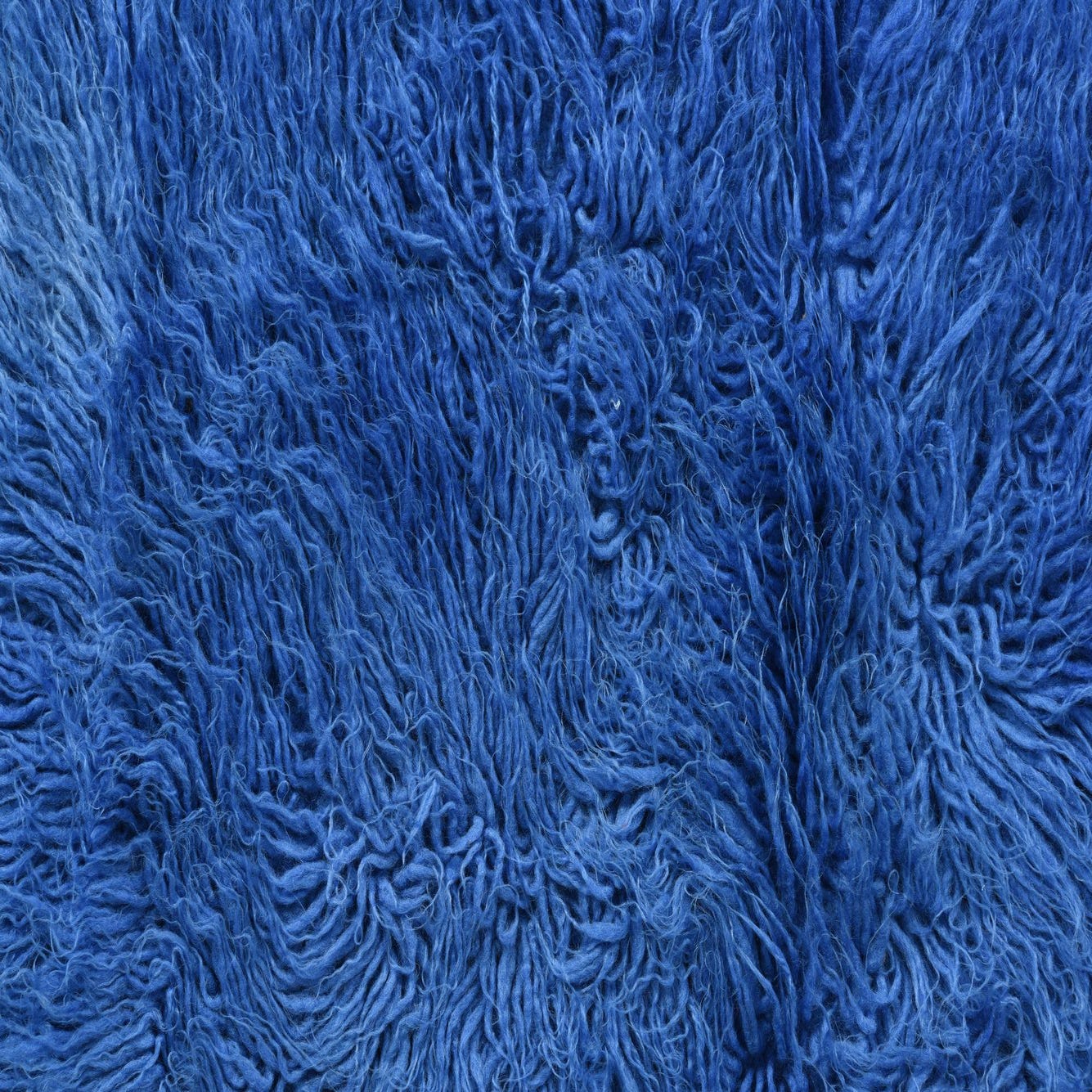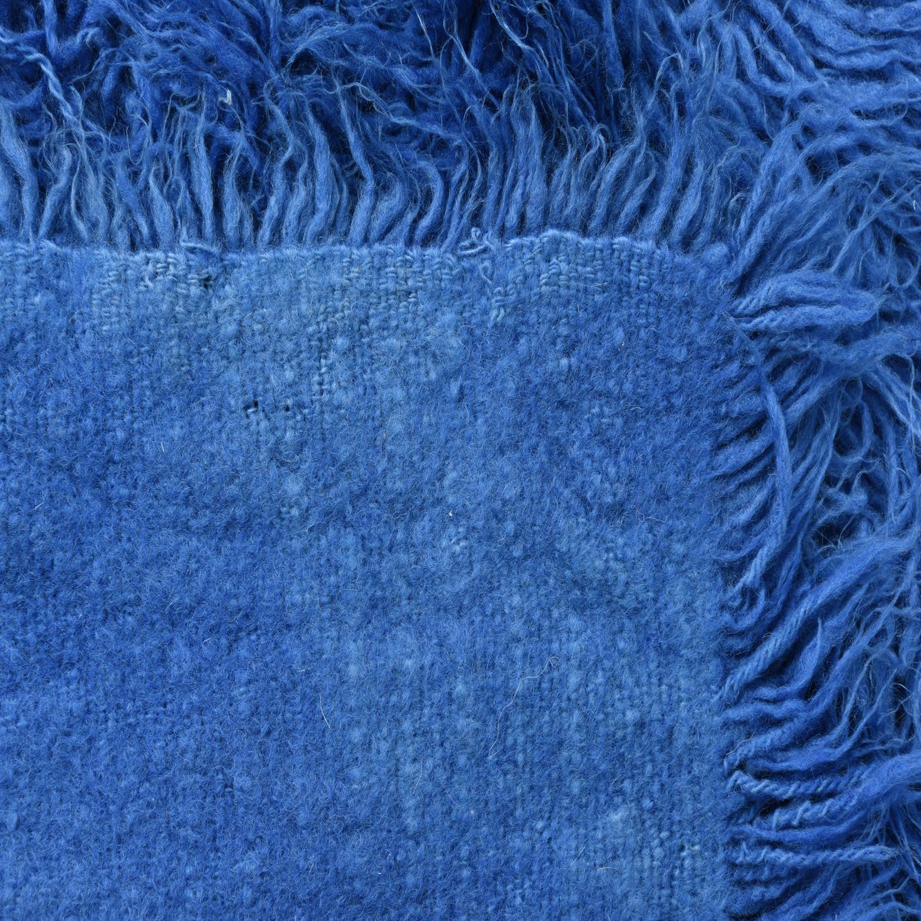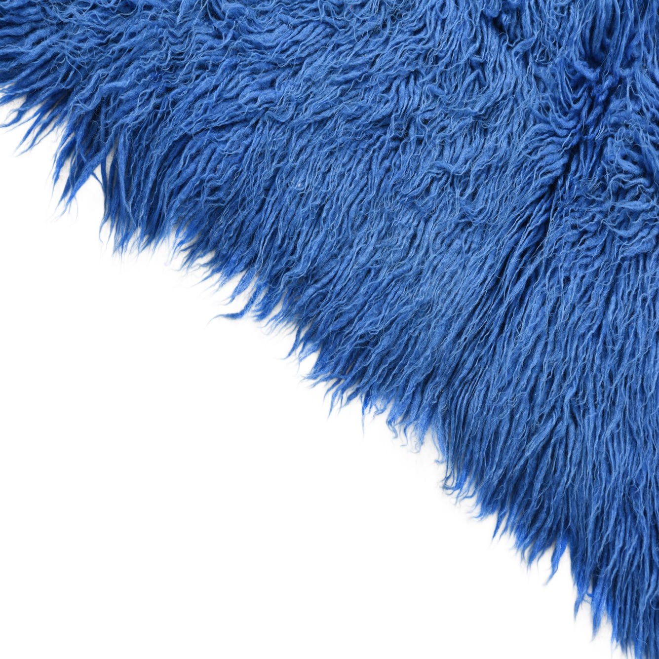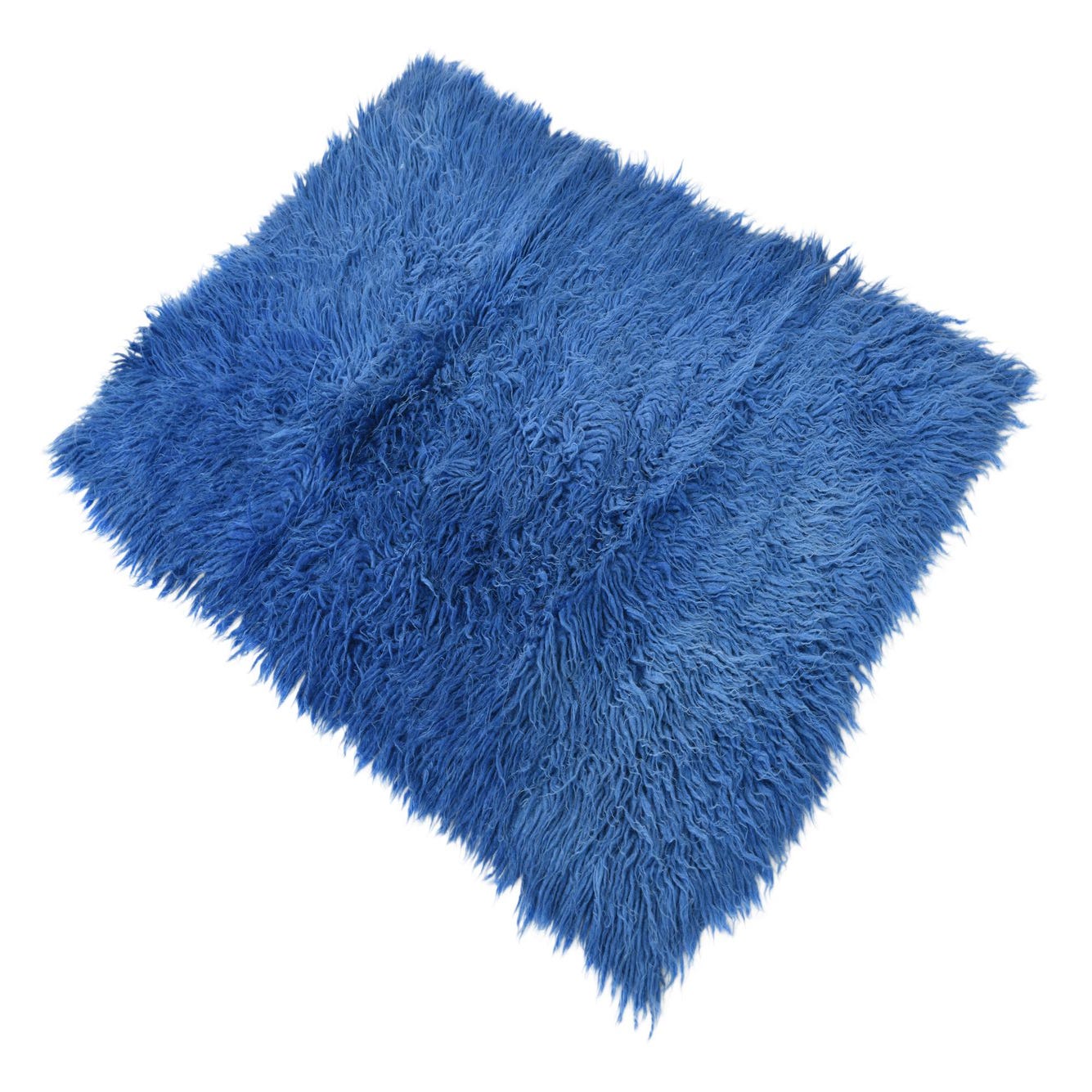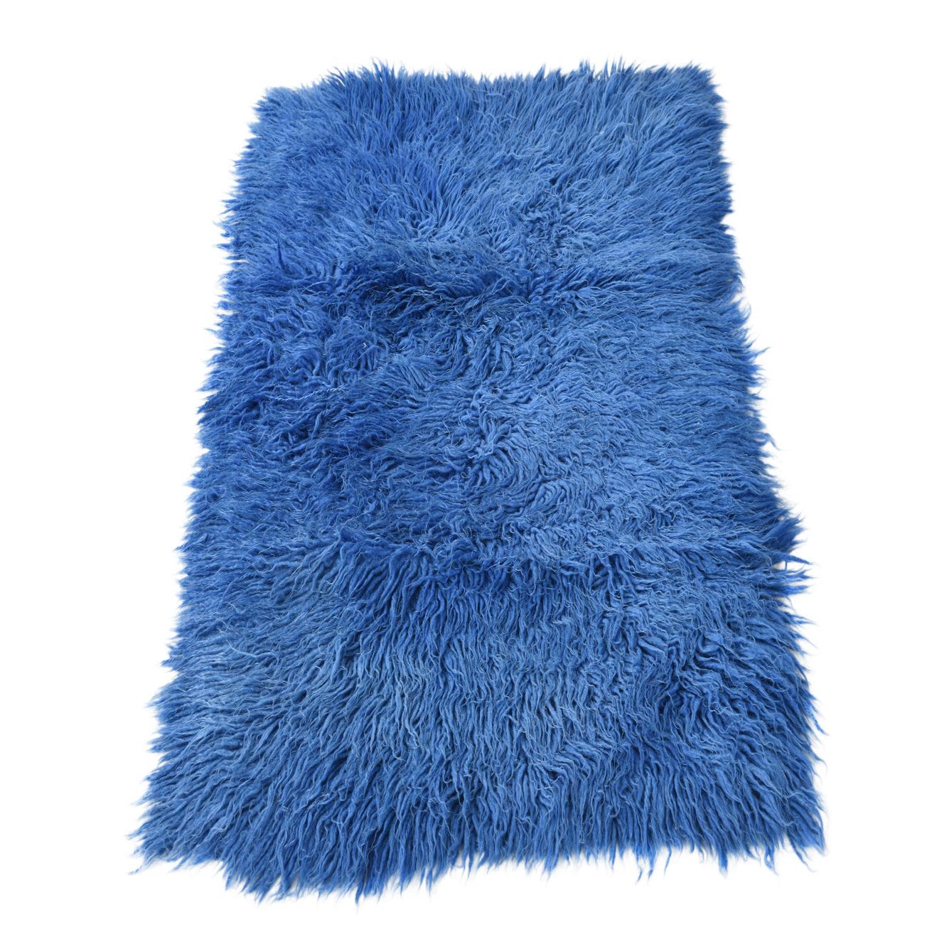A rectangular 2x3 blue shag rug made of 100% wool, featuring a plush, high pile texture.