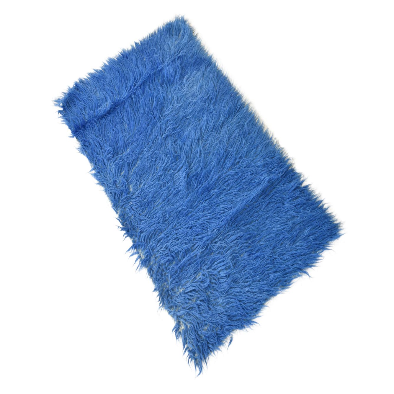 A rectangular 2x3 blue shag rug with a thick, plush pile, handmade from wool, ideal for indoor spaces.