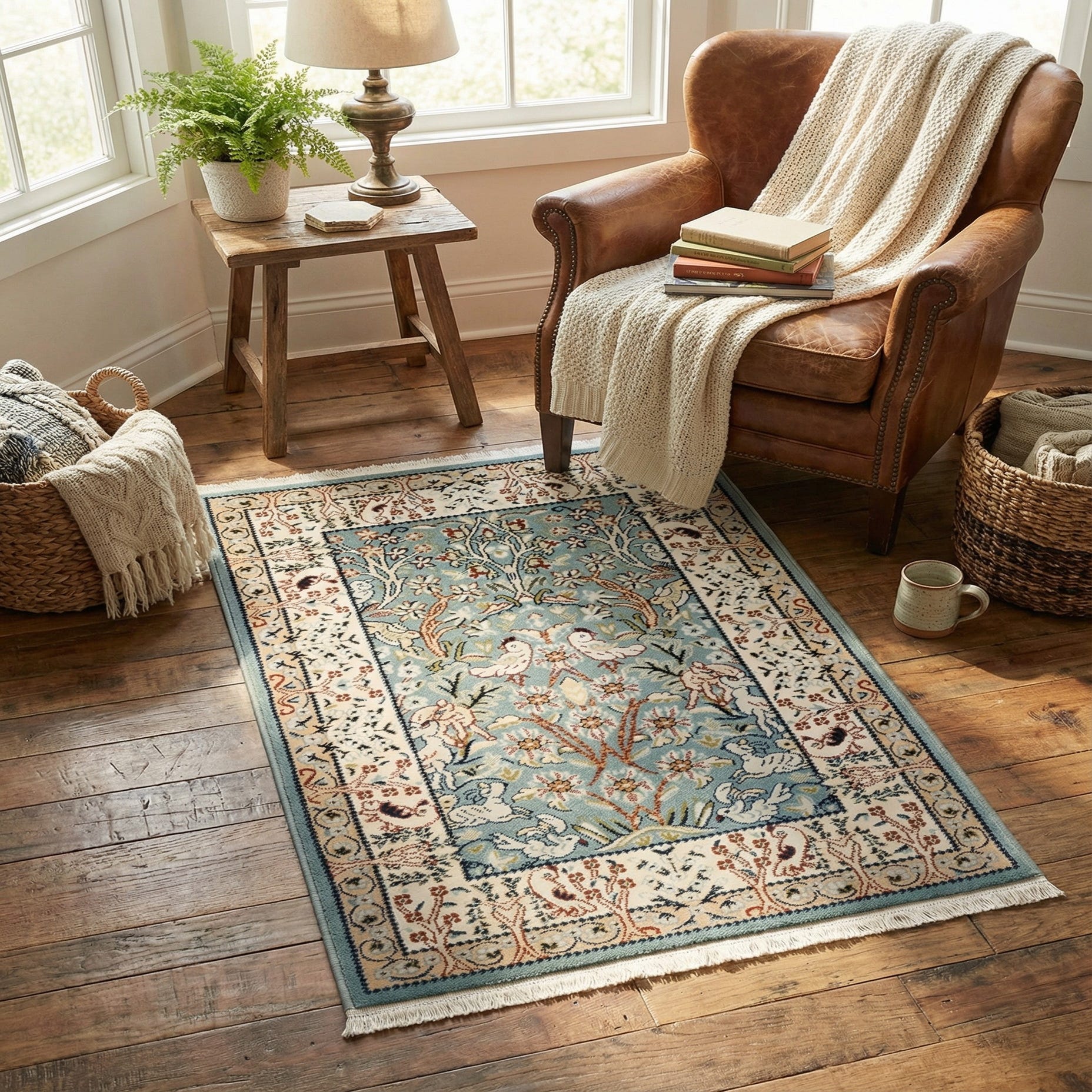 This piece works well in smaller layered settings — try it in an entryway beneath a console, at the foot of a bed, or tucked into a cozy reading corner. Its blue ground pairs naturally with navy or ivory upholstery and complements warm wood tones like oak or walnut; echo the rug’s burgundy and puce accents in pillows or artwork to pull the room together. The design suits traditional and transitional interiors as well as cottage or coastal-inspired spaces seeking a bit of refined pattern.