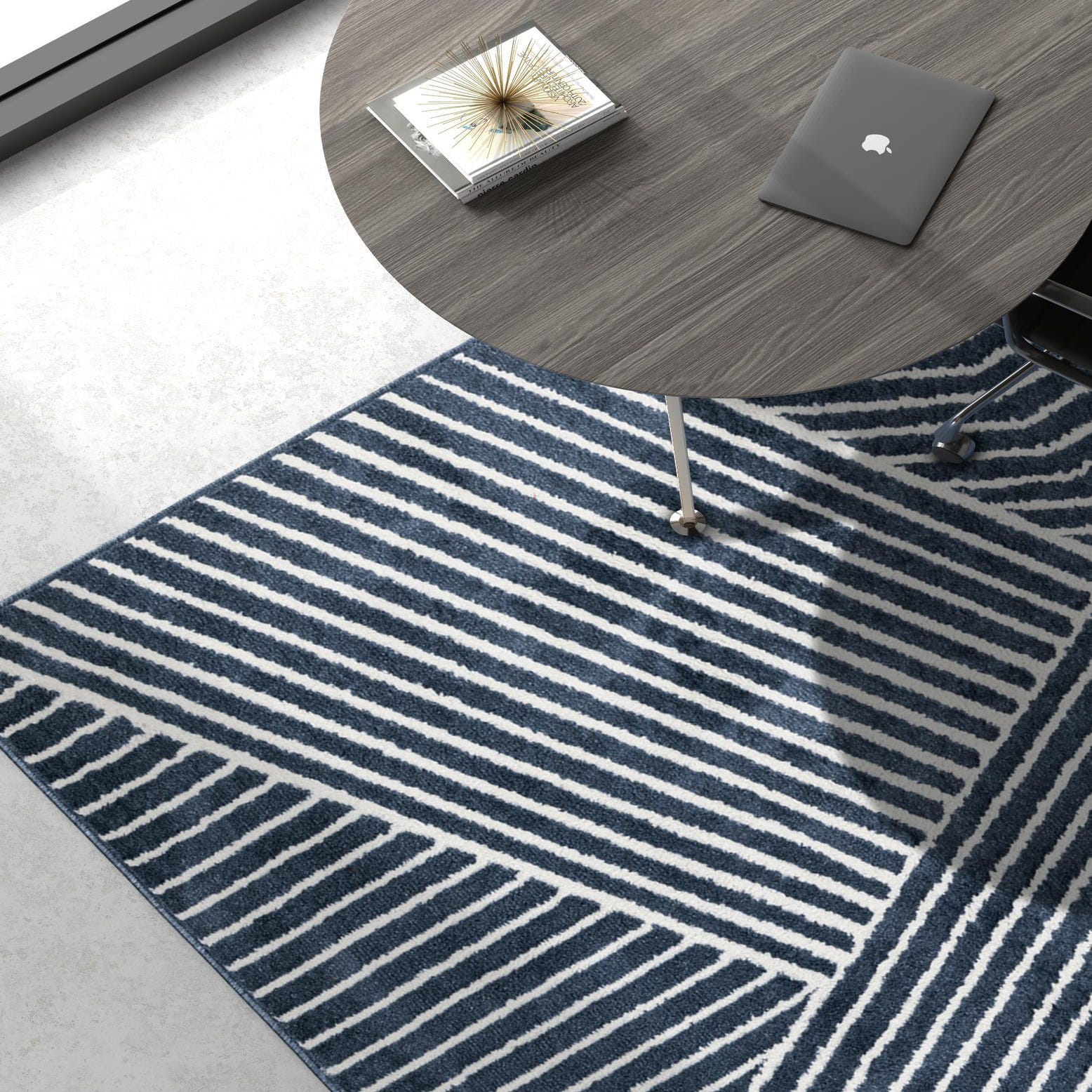 A bold, geometric stripe pattern cuts across a deep blue background in alternating panels of vertical and diagonal lines. Ivory banding contrasts cleanly with the blue to form angled blocks that bring movement and structure to the design. Machine-made from 100% polyester, this rug combines a modern graphic look with easy-care synthetic construction.