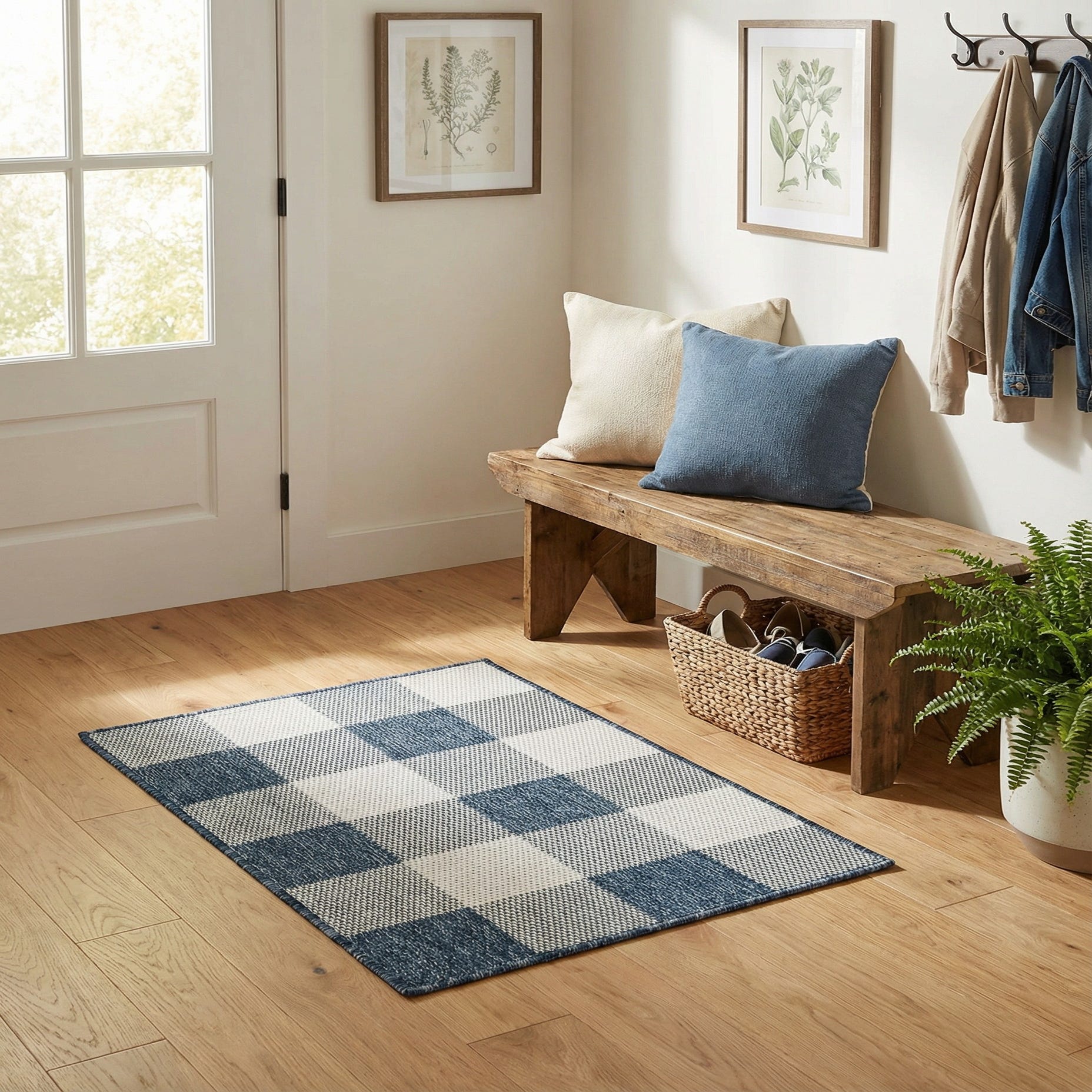 This low-profile piece works well on a covered patio, balcony or sunroom, and also fits entryways, kitchens or casual dining nooks where a simple pattern keeps the space grounded. Pair it with whitewashed wood and rattan for a coastal or cottage look, combine it with warm woods and metal accents for a modern farmhouse vibe, or layer it under a small bistro set to bring graphic interest to compact outdoor or indoor seating areas.