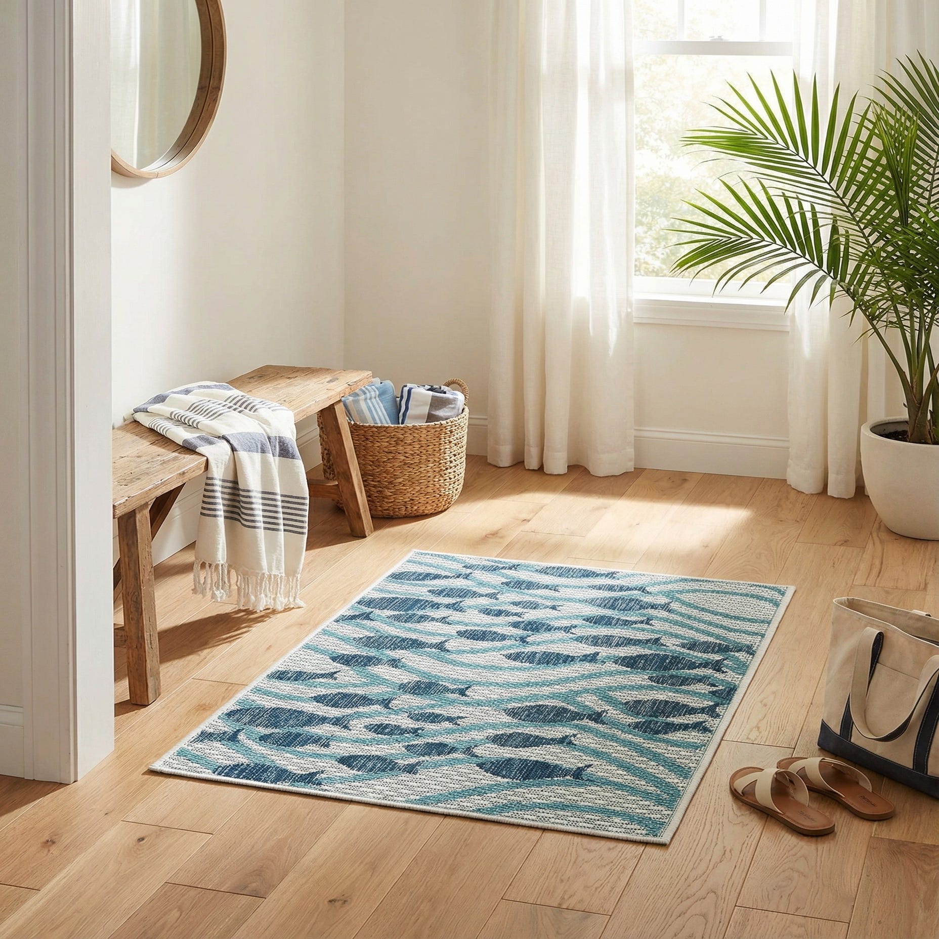 This rug can be the focal point in a small seating area, serve as a welcoming entryway element, or enhance a bathroom with a marine flair. Its weather-resistant quality makes it an ideal choice for accessorizing outdoor patios, decks, or poolside areas, harmonizing with the natural blues of sky and water.