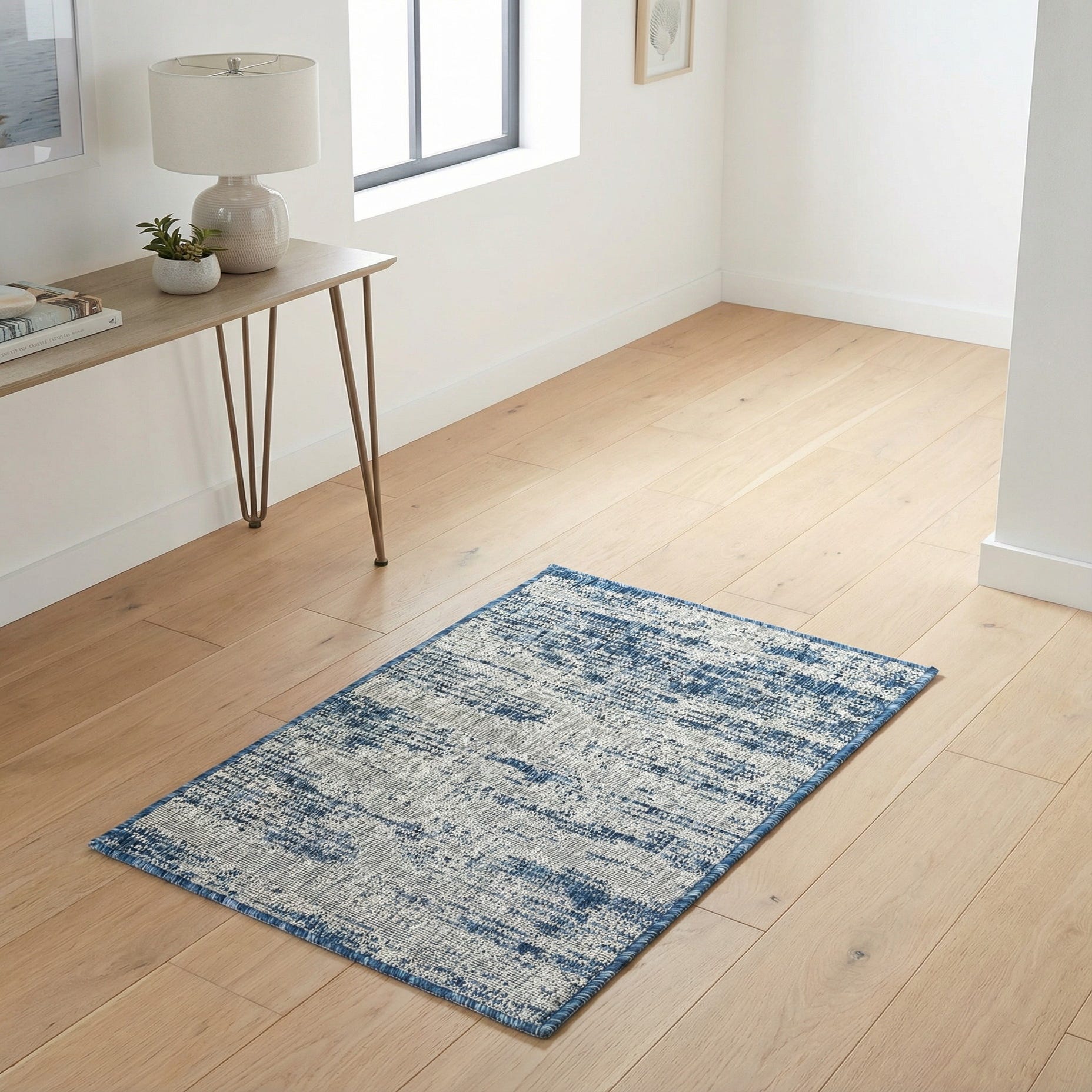 This rug works well in contemporary, coastal, or transitional outdoor and indoor spaces. Place it on a small balcony or under a bistro table to add color without bulk, layer it in an entryway to define a compact zone, or use it in a sunroom to complement light wood and white furnishings. Its clean, modern pattern pairs particularly well with natural fibers, rattan accents, and streamlined metal or painted furniture.