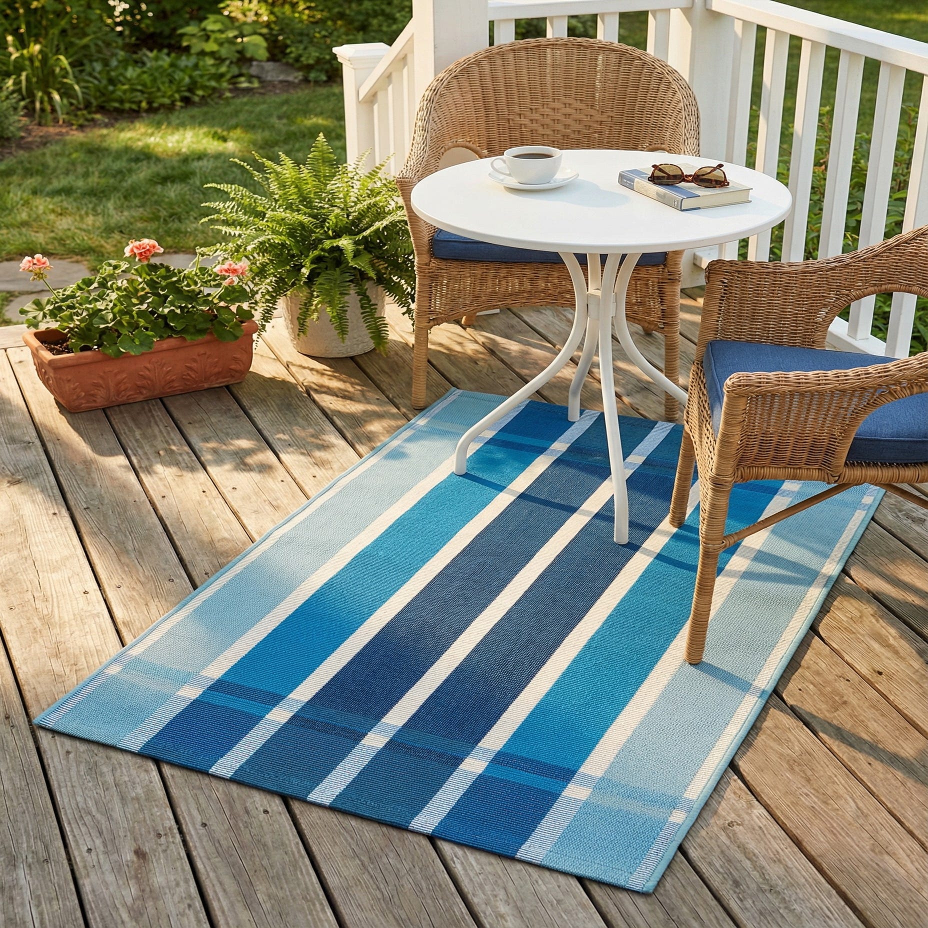 A 2x3 rectangular blue modern striped rug featuring varying shades of blue and white vertical stripes, suitable for indoor or outdoor use.