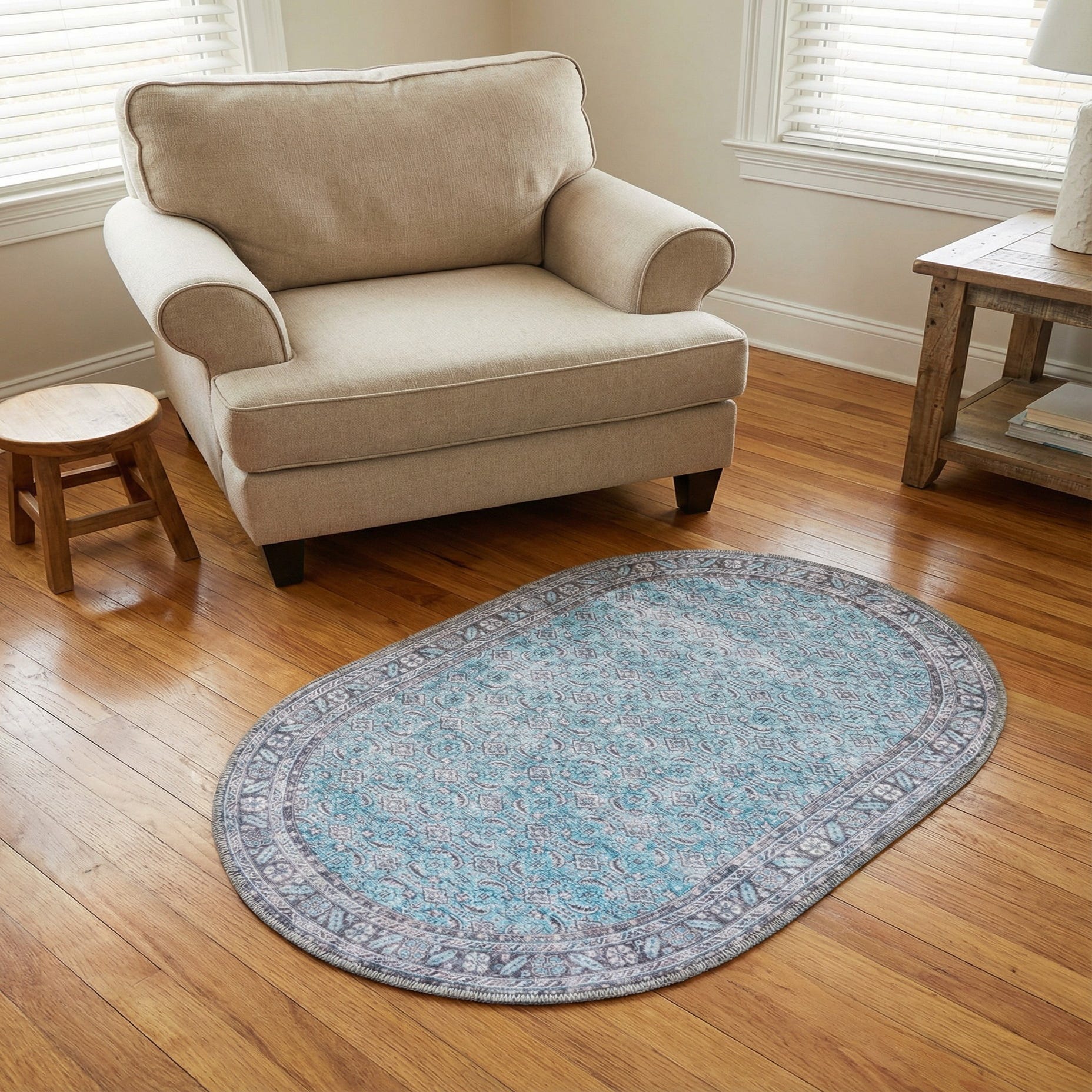 Soft to the touch and low profile underfoot, this oval accent rug shows a fine, small-scale floral and geometric repeat set against a blue background. A narrow decorative border in black and ivory frames the field, with the pattern given a softly worn, vintage-inspired finish that lets the blue read as the primary color while the black and ivory accents provide contrast and definition. Machine-made of 100% polyester, the weave produces an even surface and clear pattern detail.