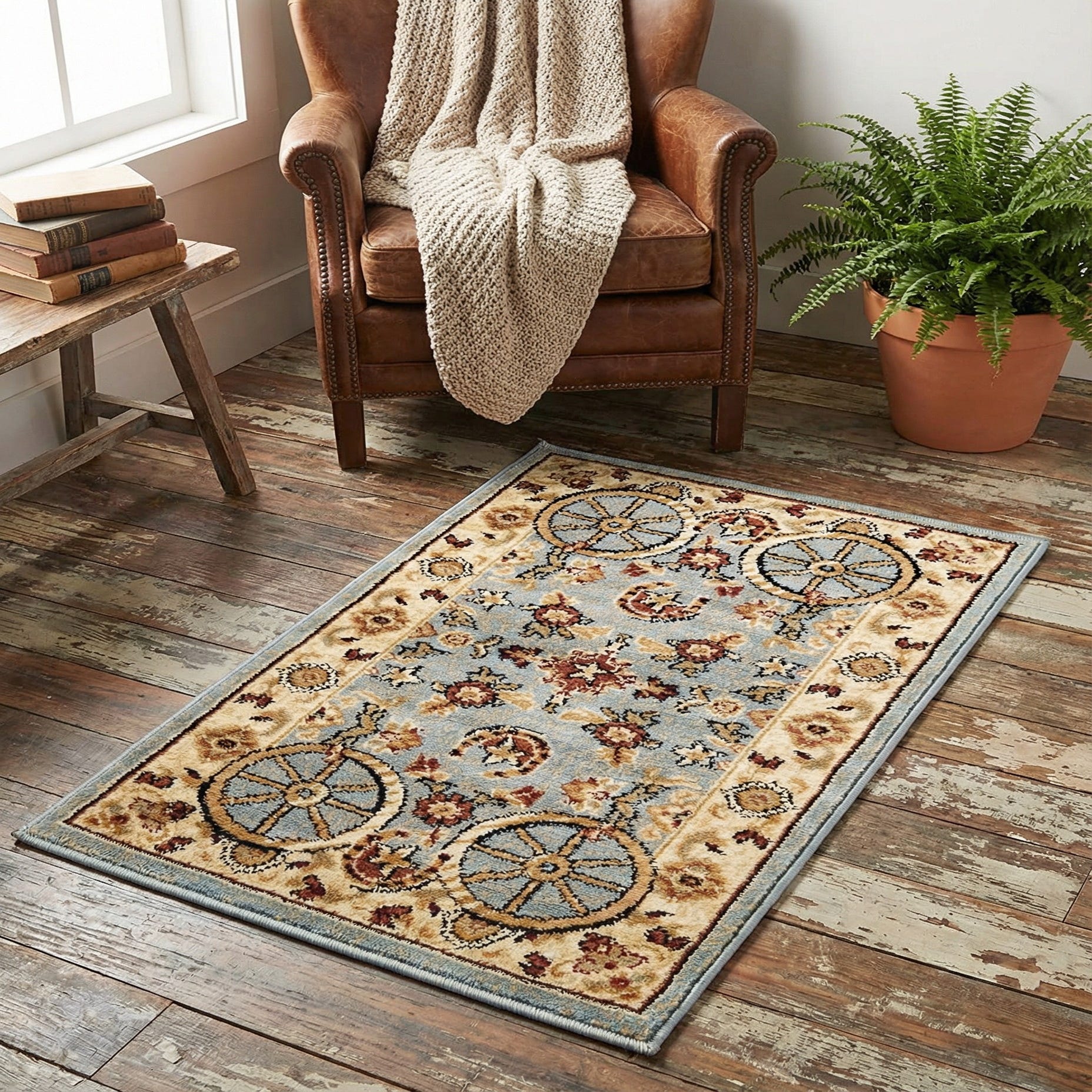 A compact, traditionally patterned rug with a blue field framed by a warm beige border. The design combines floral rosettes and medallion accents with two prominent spoked circular motifs at either end, all tied together with subtle black, brown and rust-red highlights. The balanced layout and classic motifs give the piece a vintage-inspired character that complements both formal and casual settings.