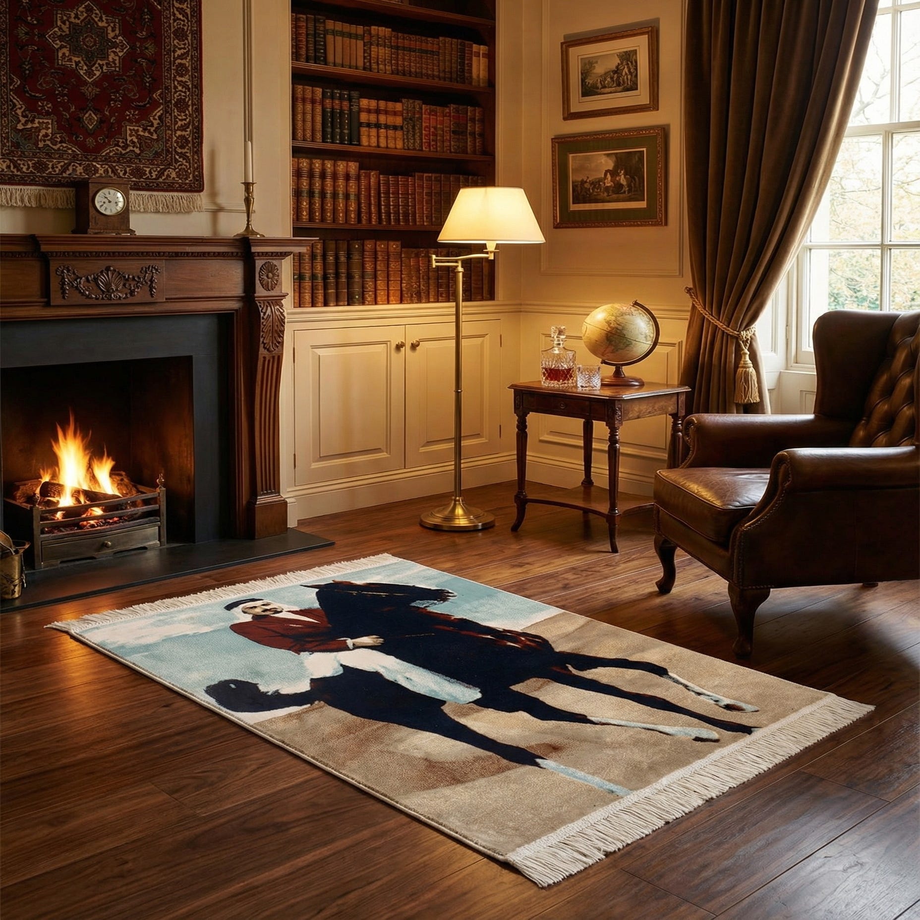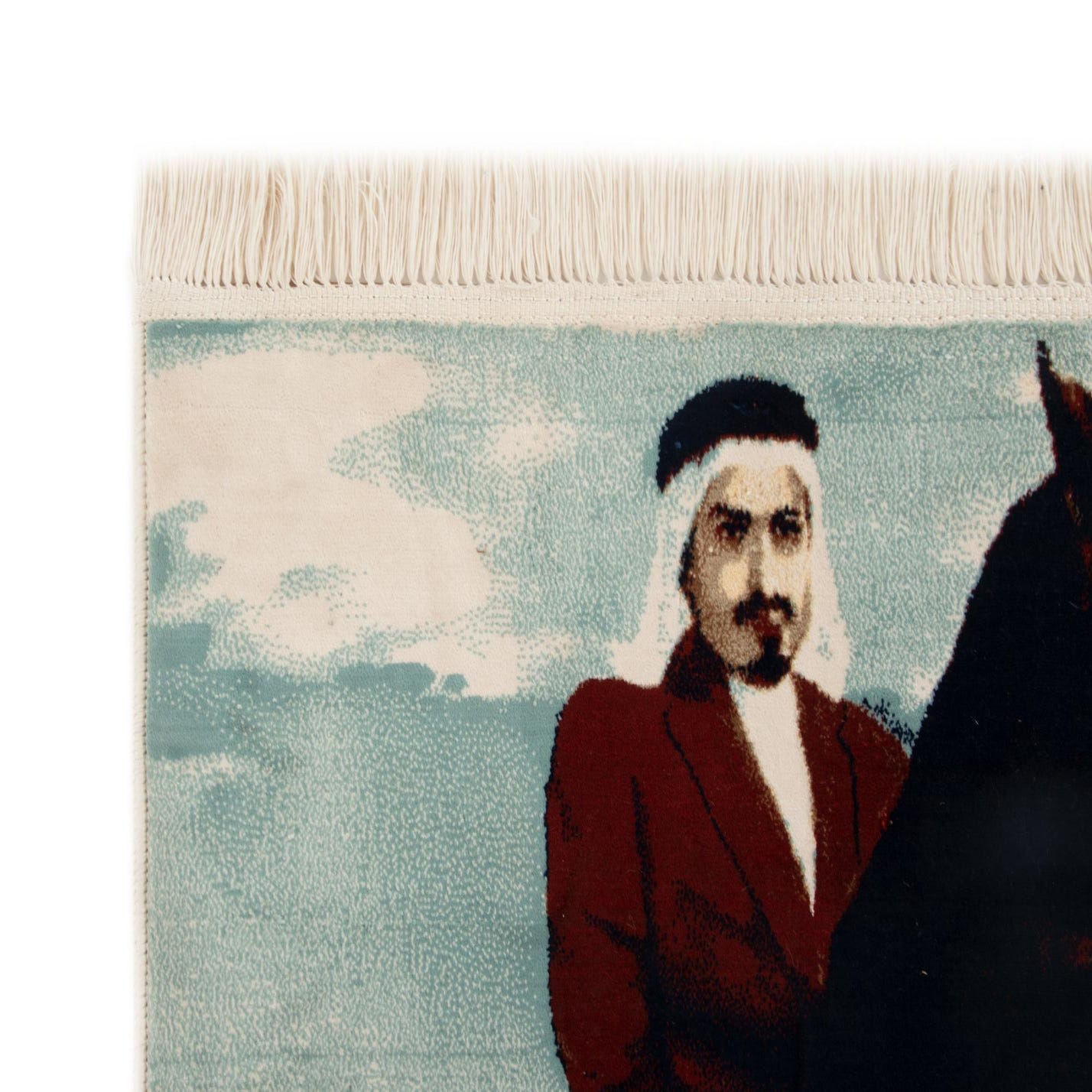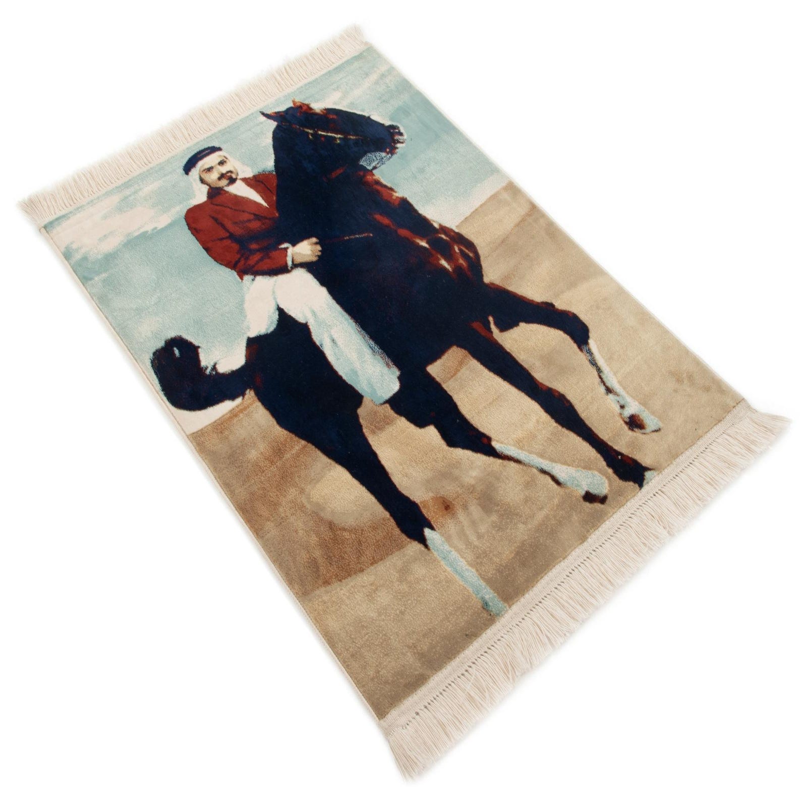 A rectangular 2x3 blue Persian rug featuring a man in traditional attire riding a dark horse across a desert landscape.