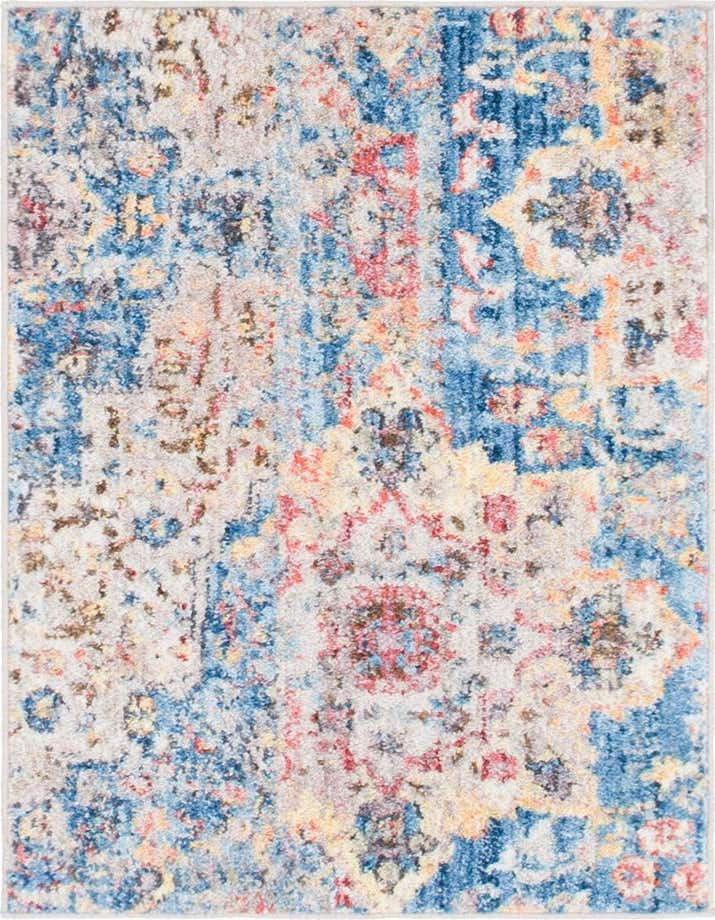 Primary color is Blue. Colors in this rug include: Blue, Beige, Brown, Orange, Red, Pink.