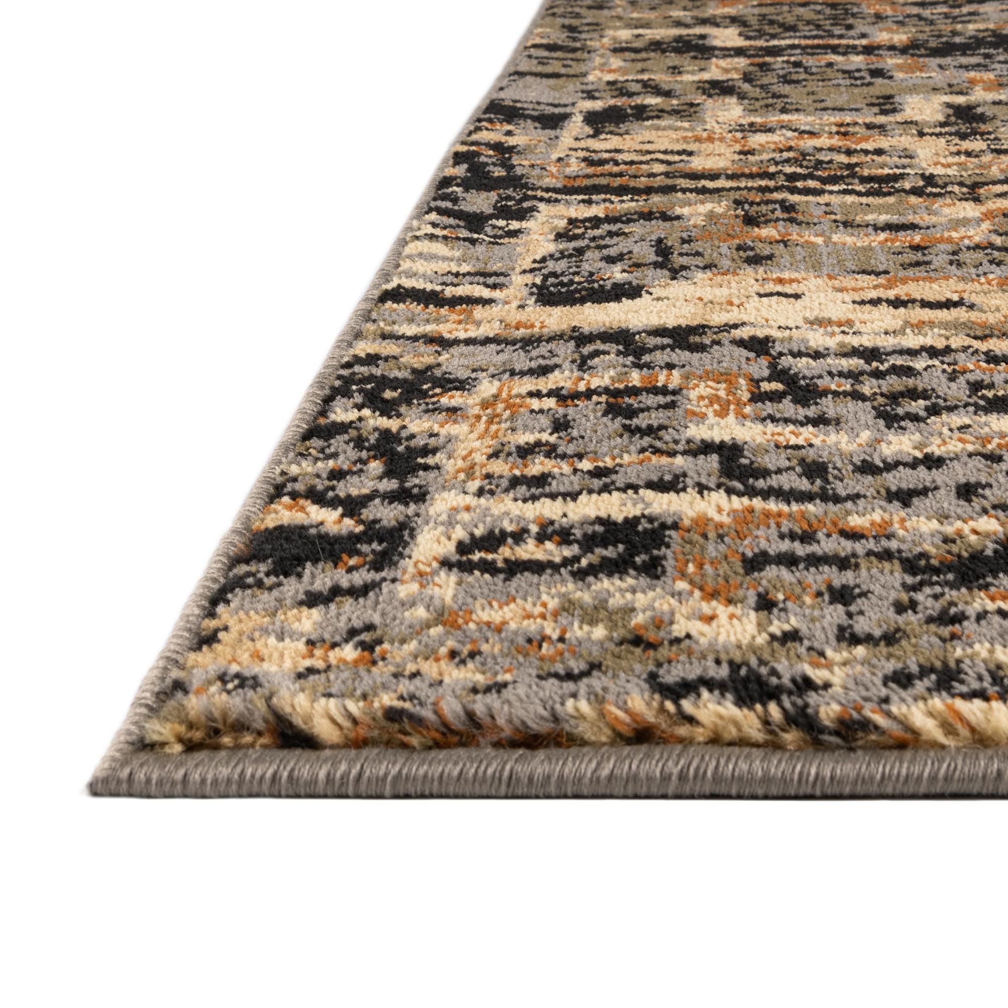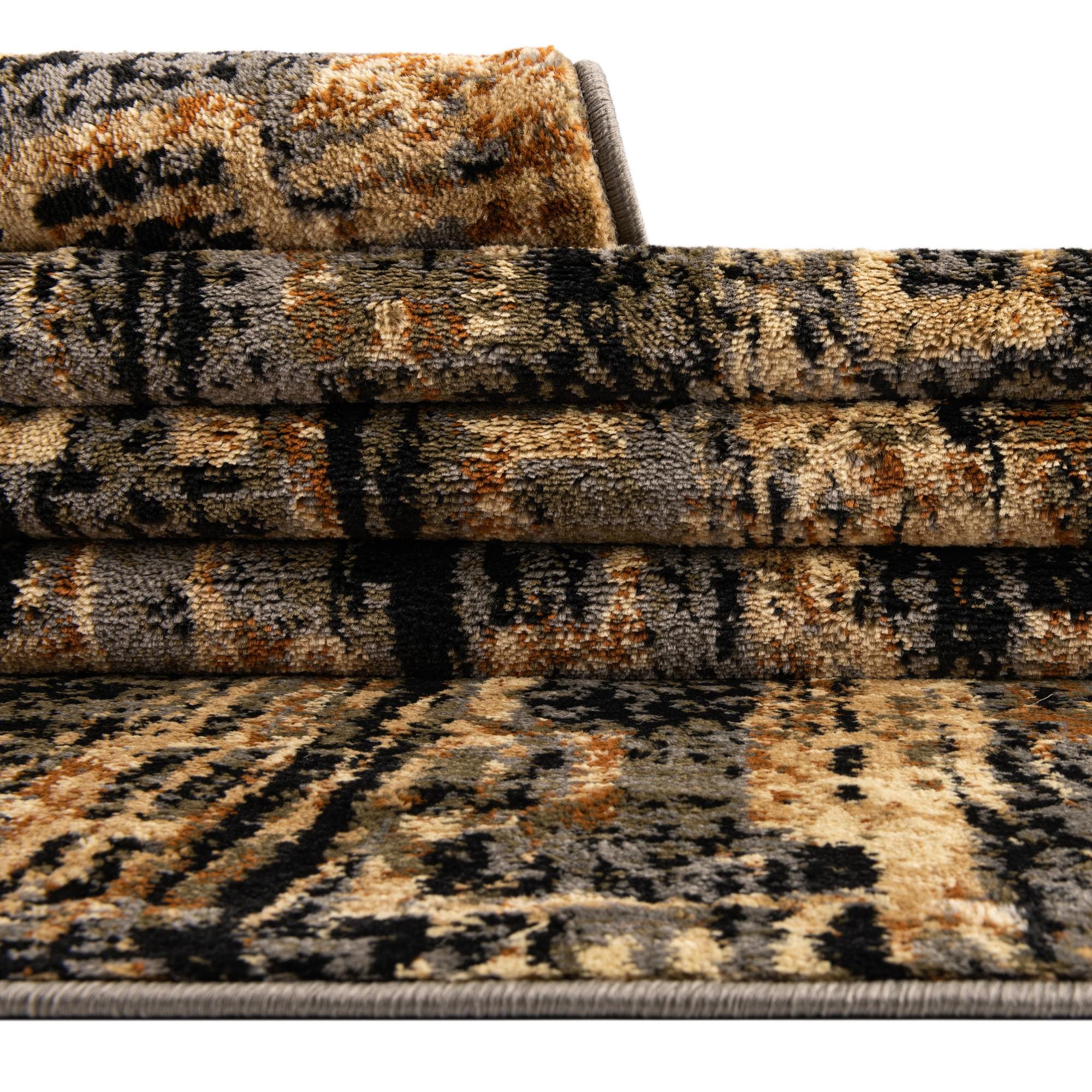 An octagonal, machine-made rug in 100% polypropylene with a blue background and an abstract, distressed geometric pattern. Bands of black, gold, gray and olive form a broken-grid motif that alternates between dense color and textured, pixel-like voids for a modern, slightly weathered look. The pile is low and tightly woven, offering a smooth, slightly cushioned feel underfoot and crisp color definition across the design.