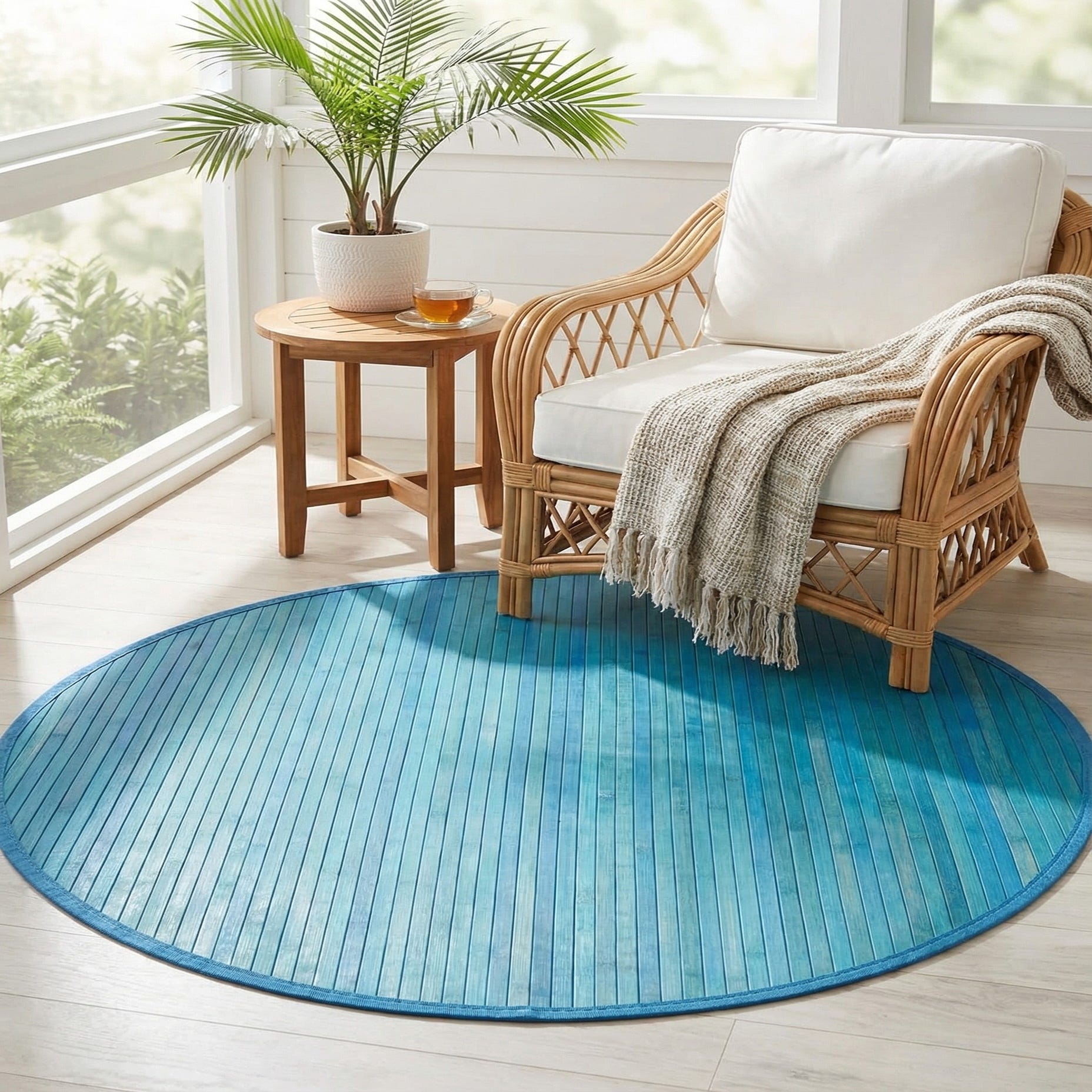 A 3' 3 x 3' 3 round blue bamboo rug with vertical slats and a fabric border.
