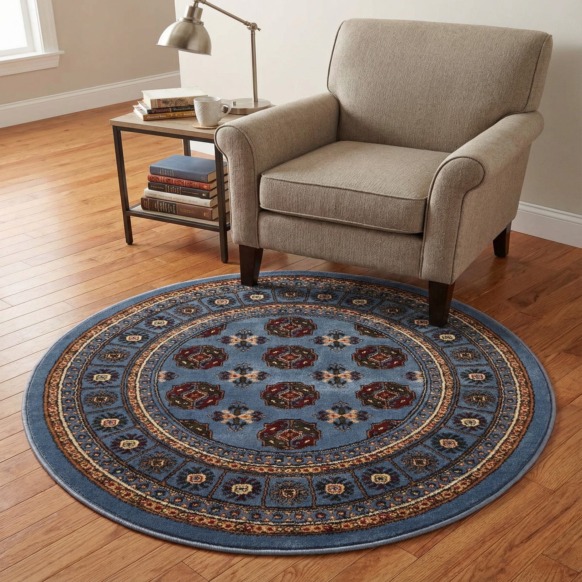 The Bokhara collection presents a machine-woven 3 Ft Round area rug crafted from 100% polypropylene for durability and longevity. Featuring a deep blue background, the rug is adorned with a symmetrical pattern that revolves around traditional motifs, with beige, black, ivory, and red accents. Notable for its defined borders that contain repeating designs, this rug showcases a central field populated with octagonal figures, commonly referred to as elephant's foot, which is a hallmark of Bokhara design.