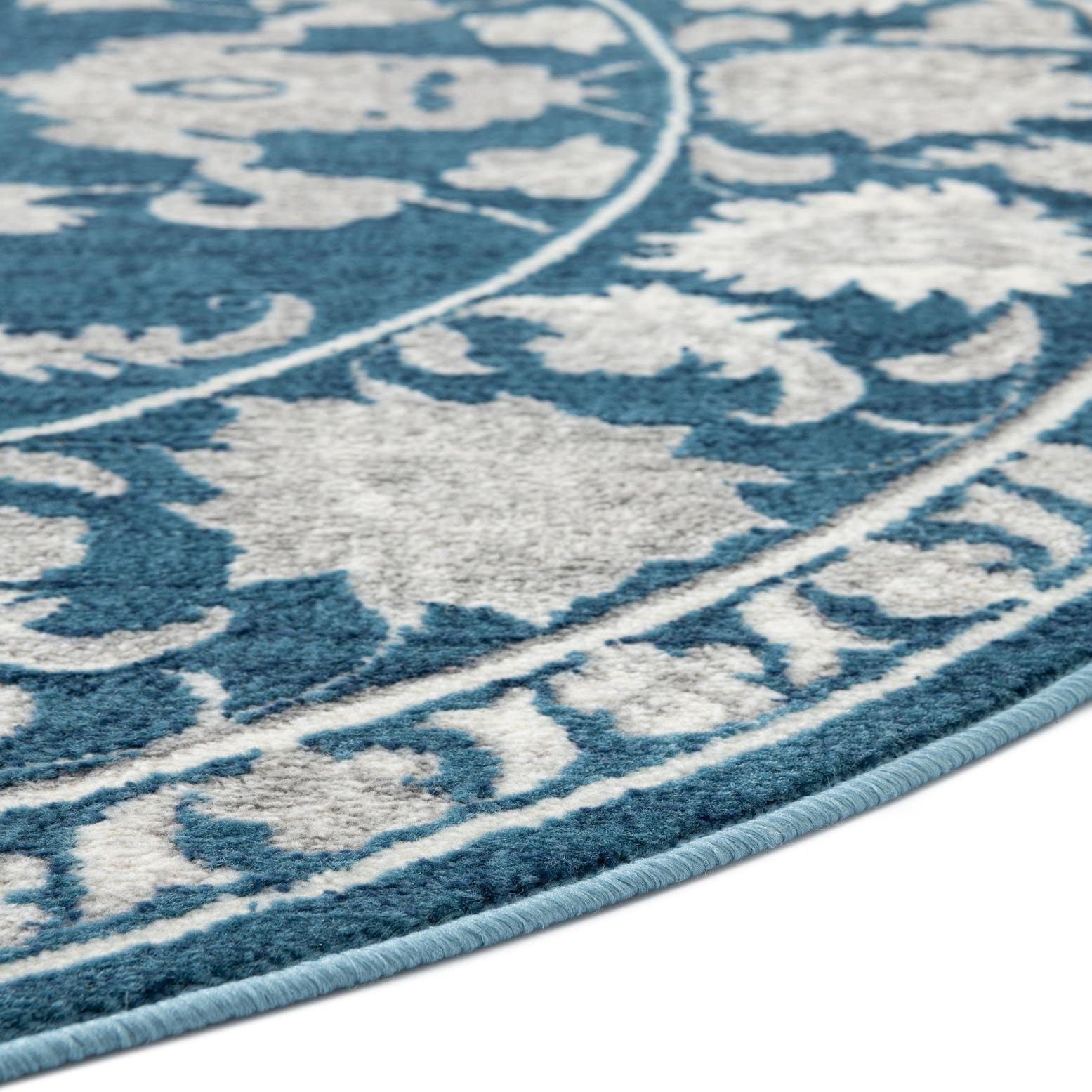 A traditional floral medallion pattern sits on a blue field, with gray and ivory motifs woven into a softly distressed layout that gives the design depth and visual texture. The round profile and balanced border lend a classic, approachable look, while the ivory highlights and gray accents create gentle contrast against the blue background. The pile has a soft, slightly plush hand with a low-to-medium profile that showcases the pattern and adds a comfortable surface underfoot.