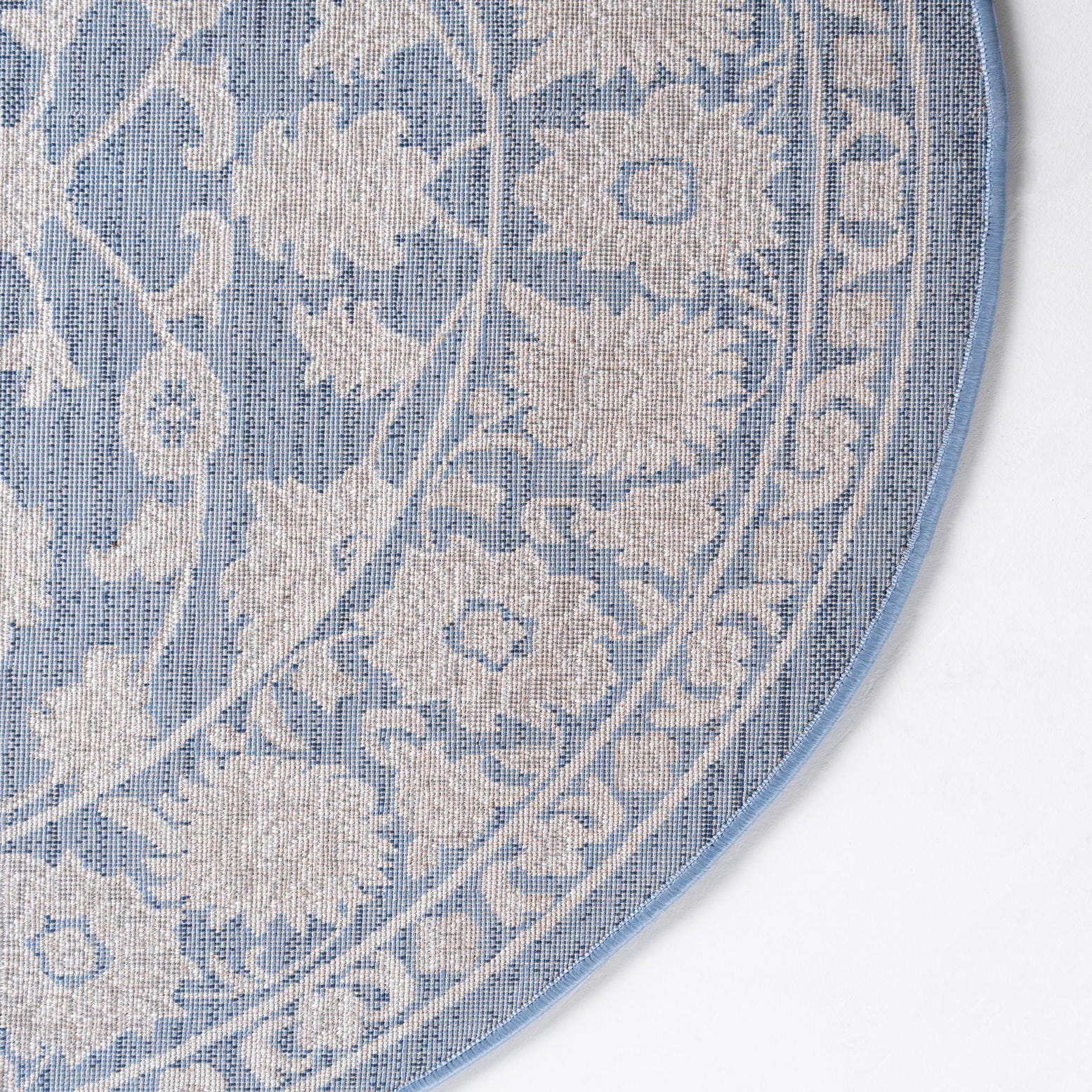 A 3' 3 x 3' 3 round blue area rug with a textured traditional botanical floral pattern in light gray.