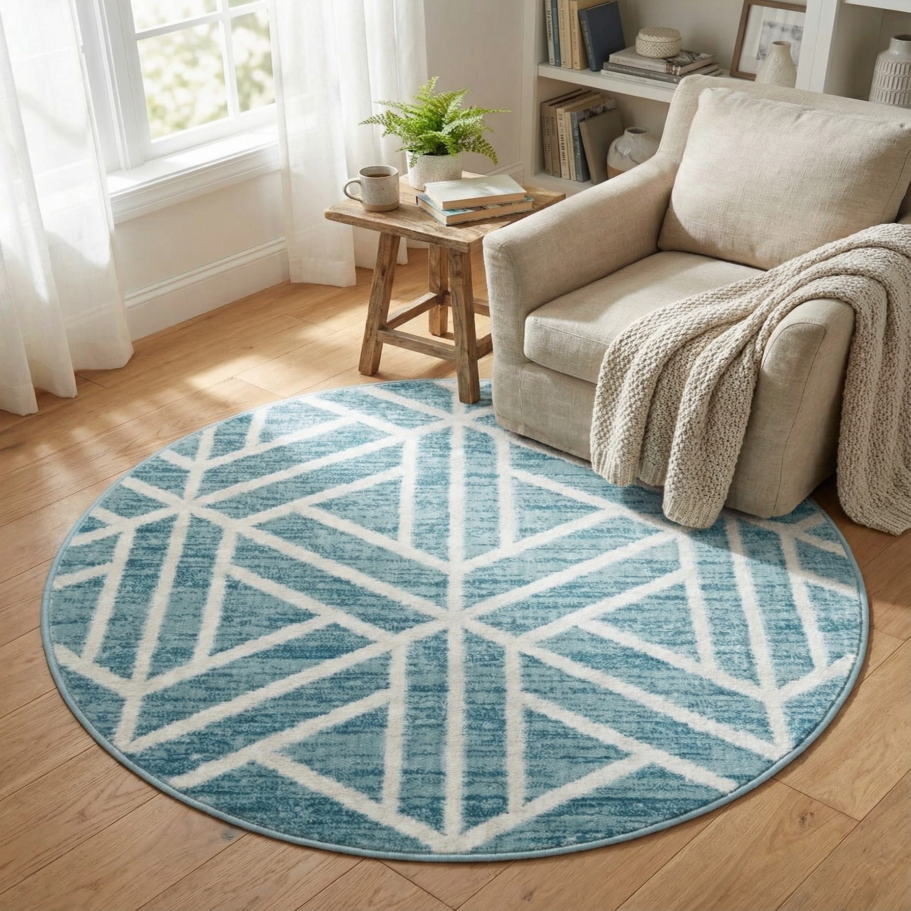 This round piece works beautifully anchored beneath a small seating group, in an entry, or under a round bistro or side table. The blue-and-ivory palette pairs easily with coastal, modern, or transitional schemes — try it with light woods and linen textiles for an airy room, or with mid-century furnishings and brass accents for a more curated look. Its defined pattern makes it a strong option for layering over a larger neutral rug or using as an accent in compact spaces.