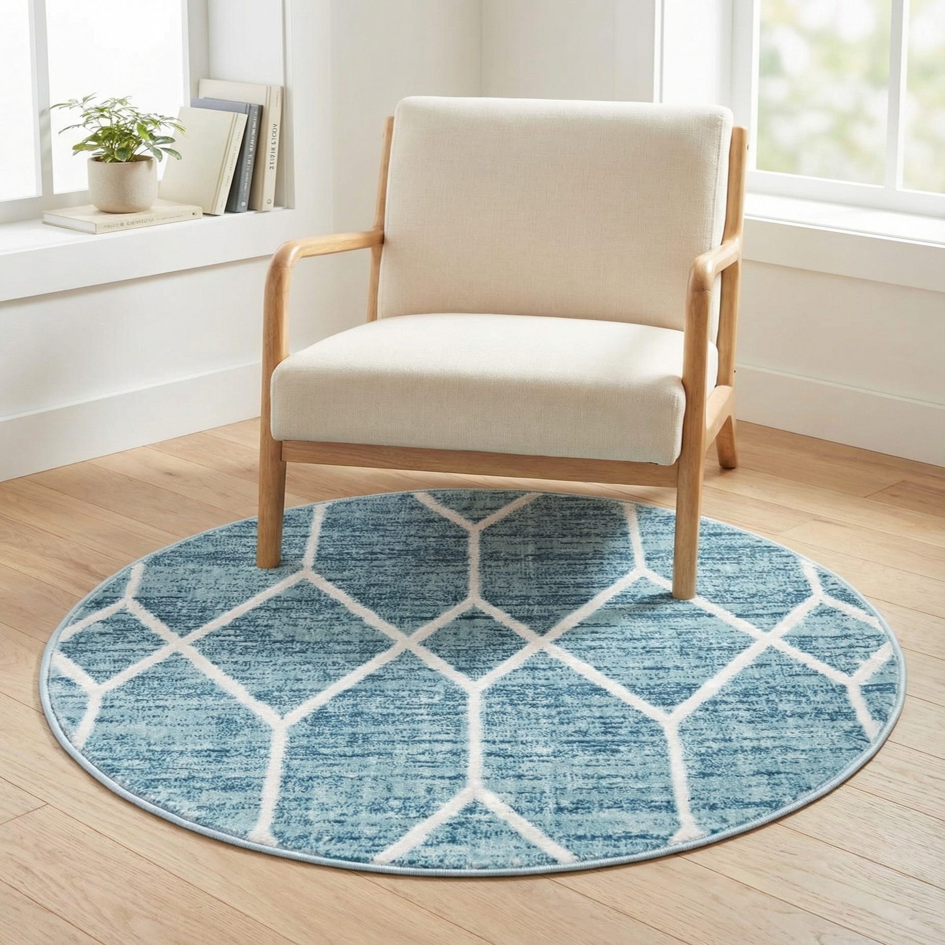 A round blue rug with a white geometric trellis pattern, featuring a textured pile and light blue border.