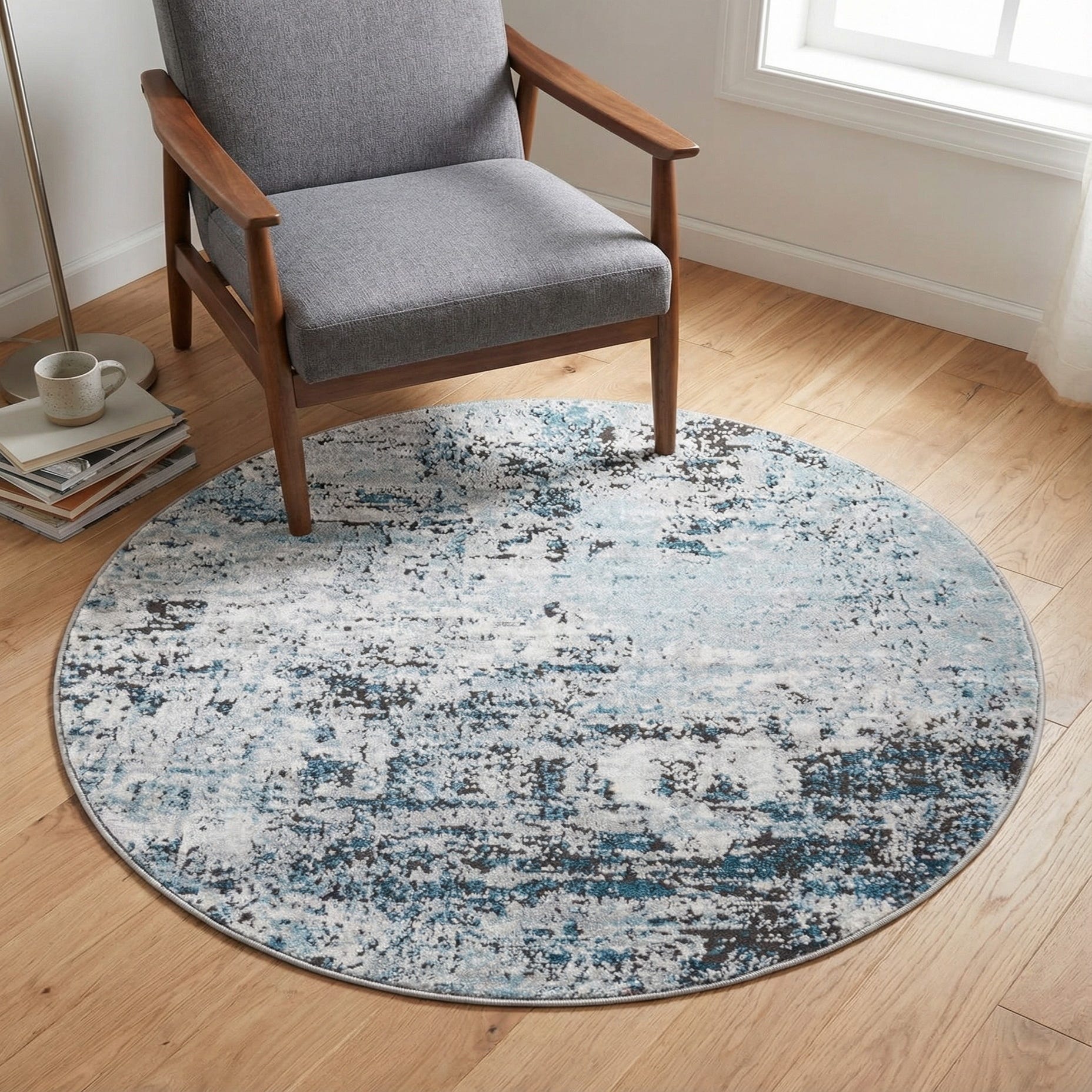 A round rug with a painterly, distressed abstract pattern set on a blue background, layered with light blue, gray and ivory accents. The varied markings create a lived-in, contemporary look that adds visual interest without a busy repeat. Machine-made of 75% polypropylene and 25% polyester, the pile sits low with a slightly plush hand and a subtle sheen, giving the surface a soft, tactile feel underfoot.