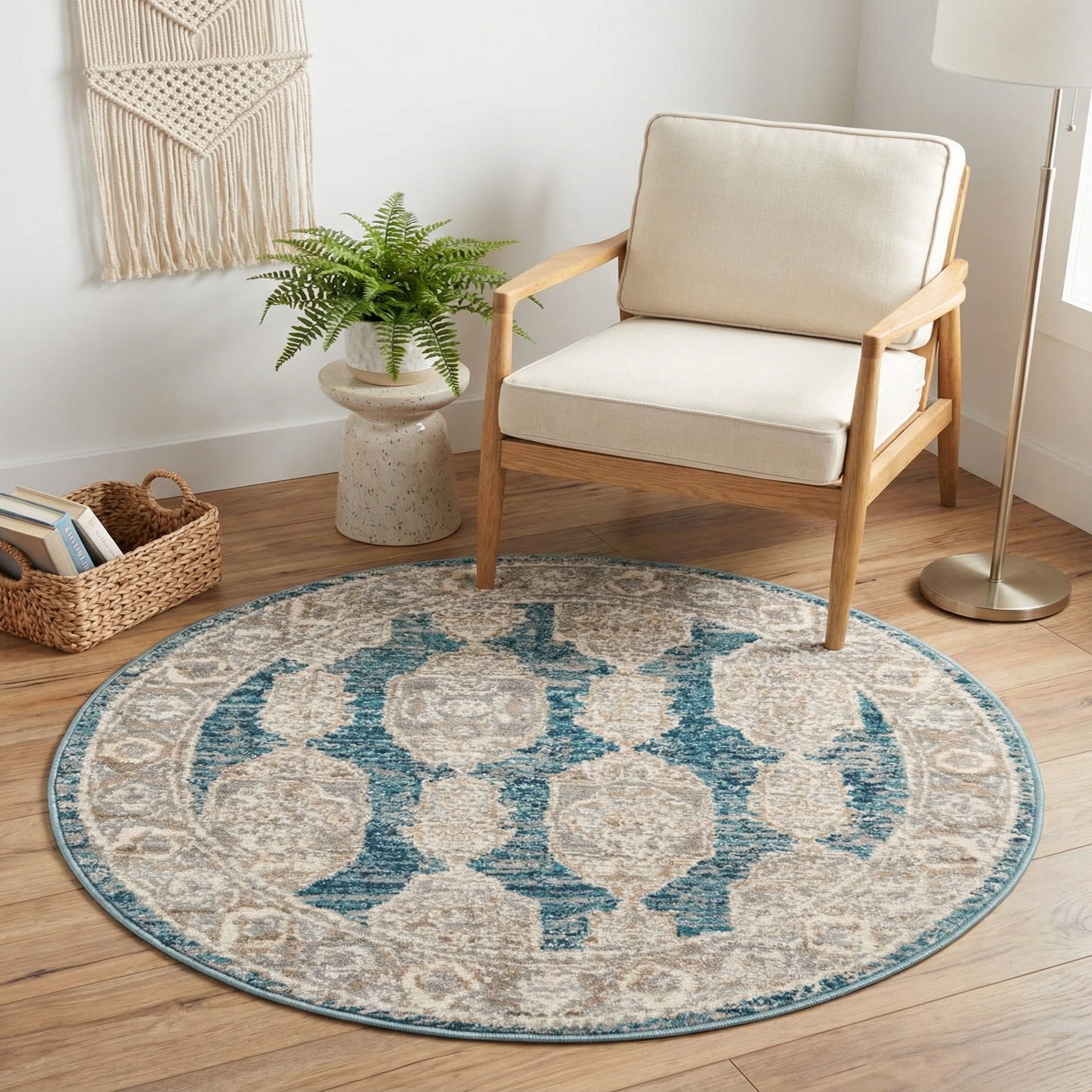 This rug works well to anchor a small seating group, define an entryway, or tuck beneath a round bistro table. It pairs naturally with coastal, transitional, or casual-traditional interiors—try it with light wood furniture or white-painted finishes to highlight the pale blues and ivories, or place it alongside a gray sofa and neutral linens for a calm, layered palette.