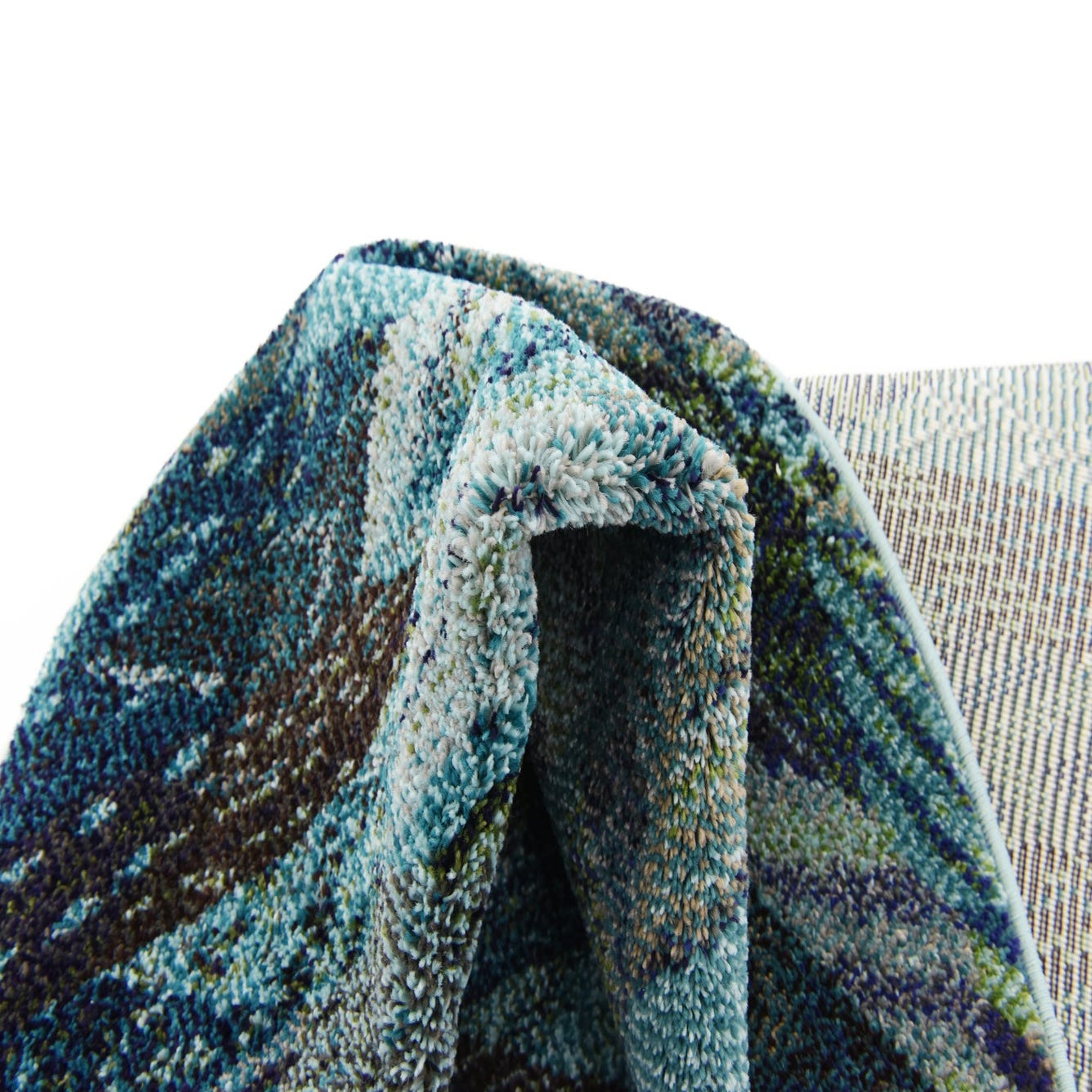 Primary color is Blue. Colors in this rug include: Blue, Gray, Green, Light Blue, Navy Blue.