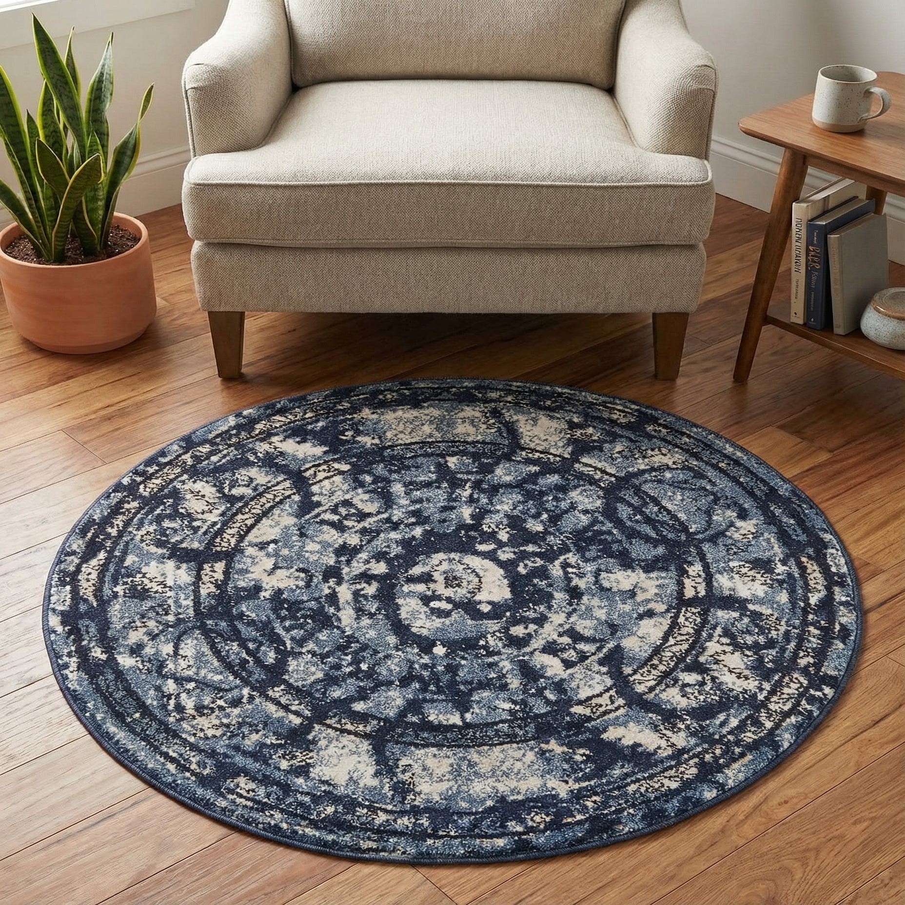 A circular rug with a worn, medallion-style pattern that balances ornamental detail and painterly distressing. The blue background anchors the design while navy blue outlines define concentric rings and filigree elements. Ivory accents and light blue speckling break up the field with a gently mottled effect, giving the surface visual depth without heavy contrast. The pile reads as low and dense, smooth underfoot with a slightly cushioned feel that highlights the subtle surface variations created by the pattern.