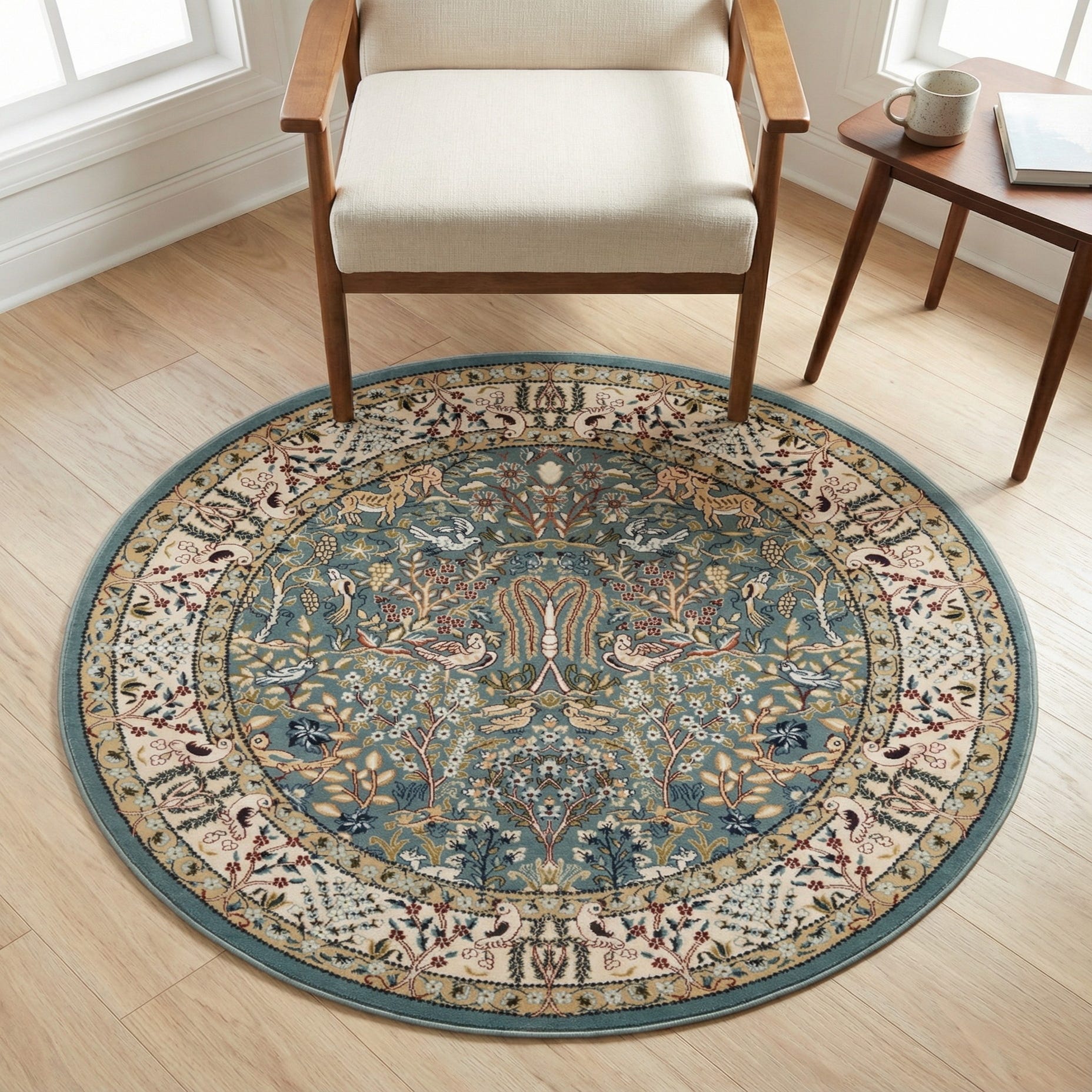 Place this rug to anchor a cozy reading nook, beneath a small bistro or accent table, or in an entry where a round shape softens a hallway. Its classic motifs and balanced color mix work well with vintage wood furniture, painted cabinetry in muted tones, or a contemporary neutral sofa paired with warm accent pillows. The patterned border and central medallion offer a focal point that complements layered textiles and mixed-metal accents without overpowering the room.