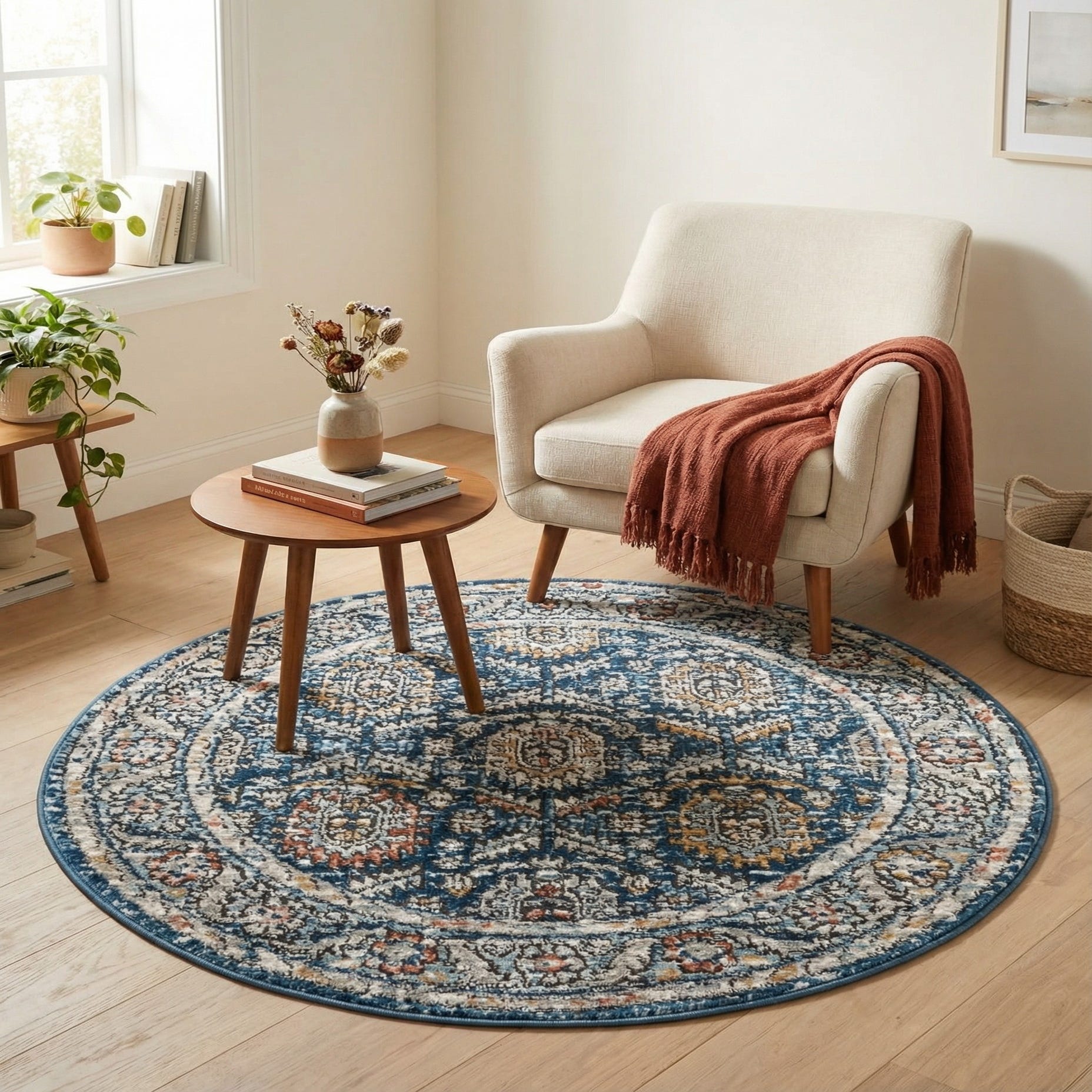 An antique-inspired medallion fills the round field with layered floral and geometric motifs and a decorative outer border. A rich blue background anchors the design while brown, gray, rust red and light blue accents weave through the pattern, creating a balanced mix of warm and cool tones. The motifs carry a gently distressed effect that gives the rug a lived-in, vintage character without overpowering a room.
