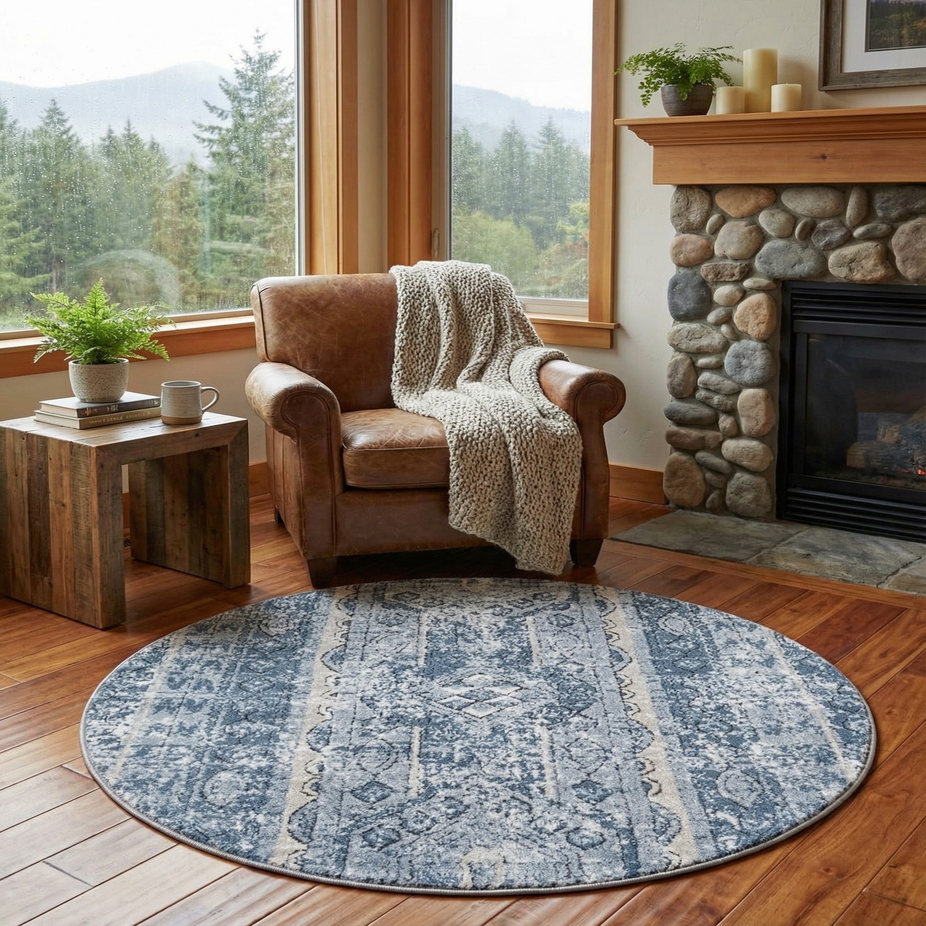 Run your hand across the surface and you'll notice the muted, tactile quality that makes this piece versatile in styling. It anchors a cozy round dining nook or bistro set, complements a coastal or transitional living room with neutral upholstery, and softens hardwood in a bedroom or reading corner. The muted palette and aged character also pair well with farmhouse, cottage, or modern-traditional schemes, and it layers nicely over a larger neutral rug to add pattern and interest.