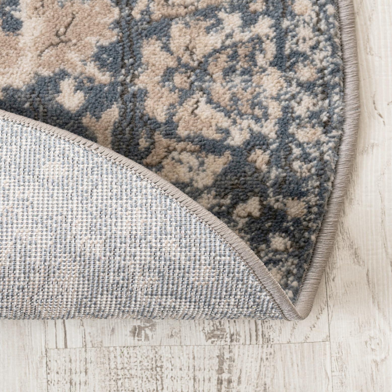 A 3' round blue and beige shabby-chic rug with a traditional floral pattern and textured pile.
